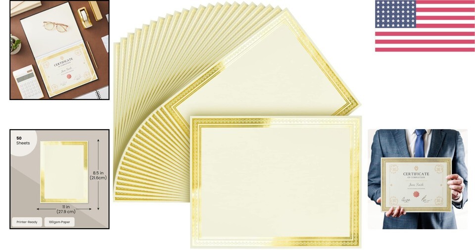 - 50 Ivory Gold Foil Certificate Sheets - 8.5 x 11 Printing for Graduation & More