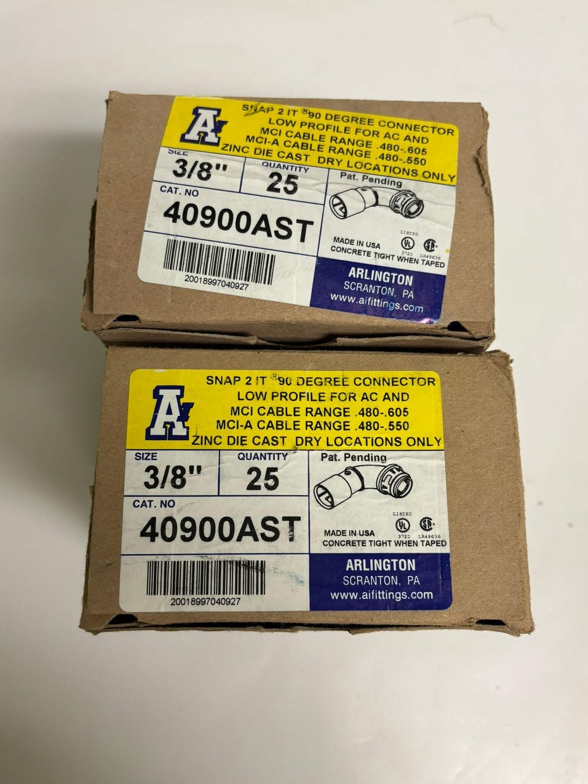 50 PK Arlington 40900AST 90 Snap2IT AC/MC/FMC Connector with Insulated Throat New The Arlington 40900AST is a 90 Snap2IT connector designed for AC, MC, and FMC cable. Made from durable zinc die-cast, it features an insulated throat to protect conductors during installation. It fits 1" knockouts and supports cable diameters from 0.480" to 0.610". This connector is cULus and CSA listed for code-compliant use. Its tool-free, snap-in design ensures fast and secure connections. Listed by: Koryon (Sales Team) " I have not failed. I've just found 10,000 ways that won't work" -Thomas A. Edison (A positive moment brought to you by Help Resale) About Us Welcome to Help Resale, your go-to consignment shop where value meets quality. At Help Resale, we're dedicated to providing you with an exceptional shopping experience, whether you're looking to find the best deals or consign your items. Need to buy a product, but don't see it in our store? Please feel free to reach out to us and we will help you find it! Help Resale 7200 Fair Oaks Blvd Suite 120 Carmichael CA 95608 Business Hours: Monday-Friday: 9:00 am to 5:00 pm (PST) All product and company names are trademarks TM or registered trademarks of their respective holders. Use of them does not imply any affiliation with or endorsement by them.