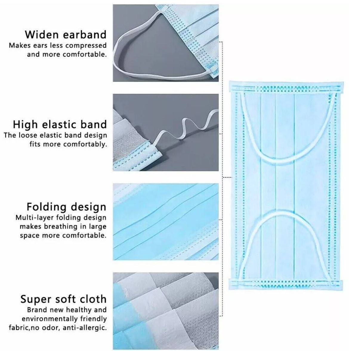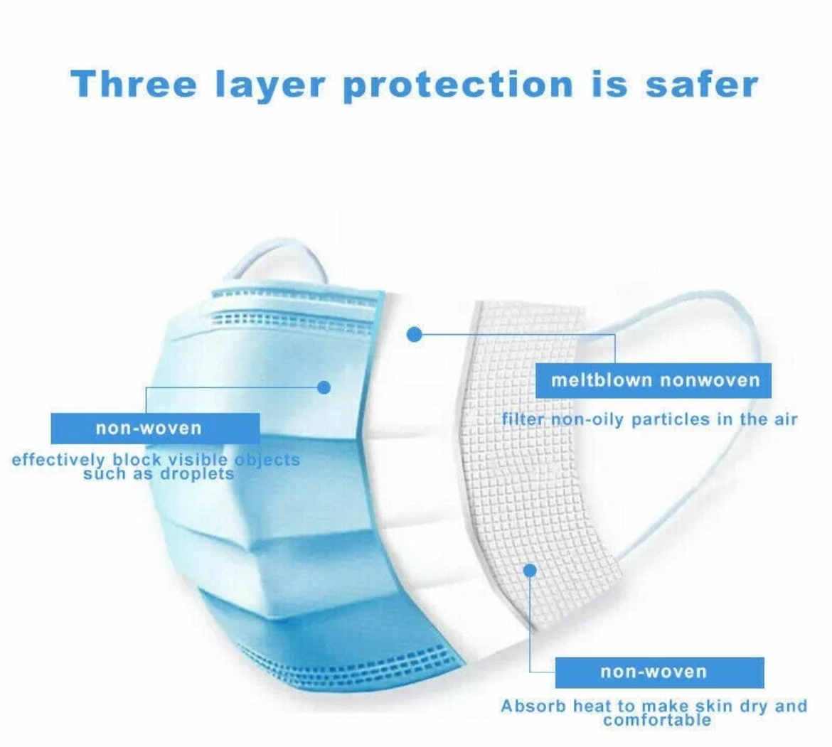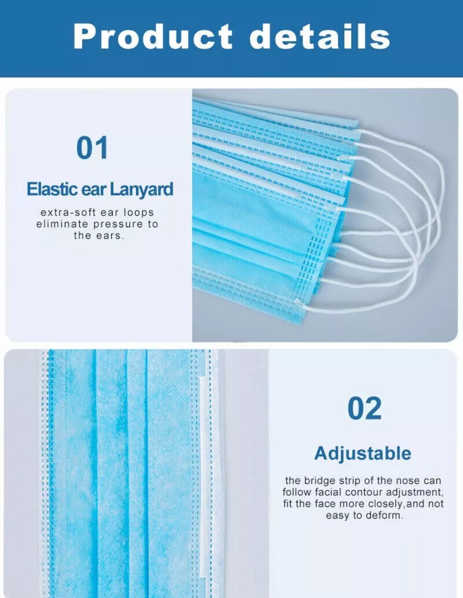 Breathe easy every day with this pack of 50 protective face masks. Each face mask made with soft, non-woven blue material for long-lasting comfort. The elastic ear loops ensure that this dust mask will easily fit your whole family, making it perfect for daily use whether you’re cleaning your house or heading to the store. Our protective face mask has been designed with three layers of filtration to protect and guard your health. The outer protective layer will block dust, odors, and large particles. The key middle melt-blown layer effectively filters out small particles. The final, inner skin-care layer is a natural and anti-allergy filter.