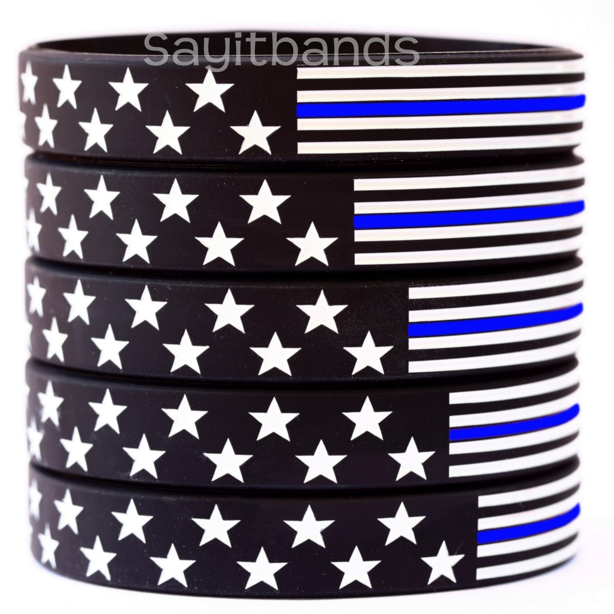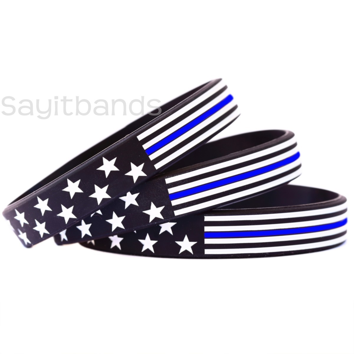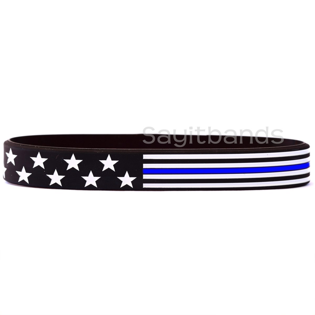 a statement and take a stand with our USA flag thin blue line wristband. The stars and stripes are all debossed and color filled for a great looking, high impact, long lasting bracelet.