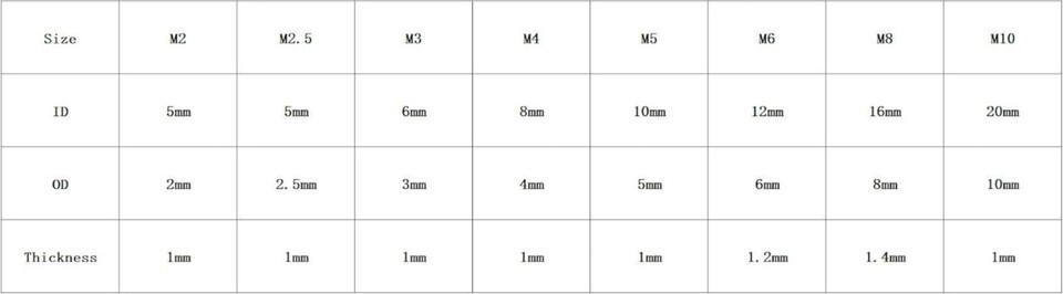 Available in sizes: M2 (5 mm x 2 mm x 1 mm), M2.5 (5 mm x 2.5 mm x 1 mm), M3 (6 mm x 3 mm x 1 mm), M4 (8 mm x 4 mm x 1 mm), M5 (10 mm x 5 mm x 1 mm), M6 (12 mm x 6 mm x 1.2 mm), M8 (16 mm x 8 mm x 1.4 mm), M10 (20 mm x 10 mm x 1 mm).