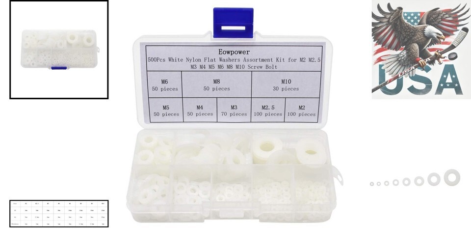 Made of high-quality nylon, this kit includes 500 precision-cut flat washers in 8 essential sizes - M2, M2.5, M3, M4, M5, M6, M8, and M10.