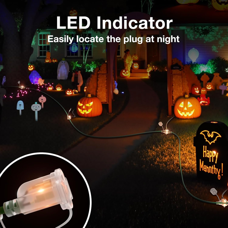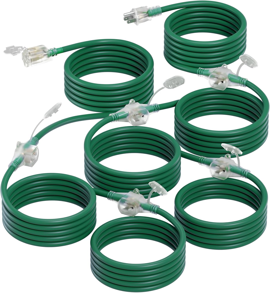 6 Outlets into 1 Cord: Evenly-spaced 8 feet apart from each outlet. The extension cord with 6 outlets helps use 1 socket to power up 6 applications. Ideal for string lights, landscape, lighting, Christmas Halloween decoration, block heater, household and office appliance and any other device that requires extended use