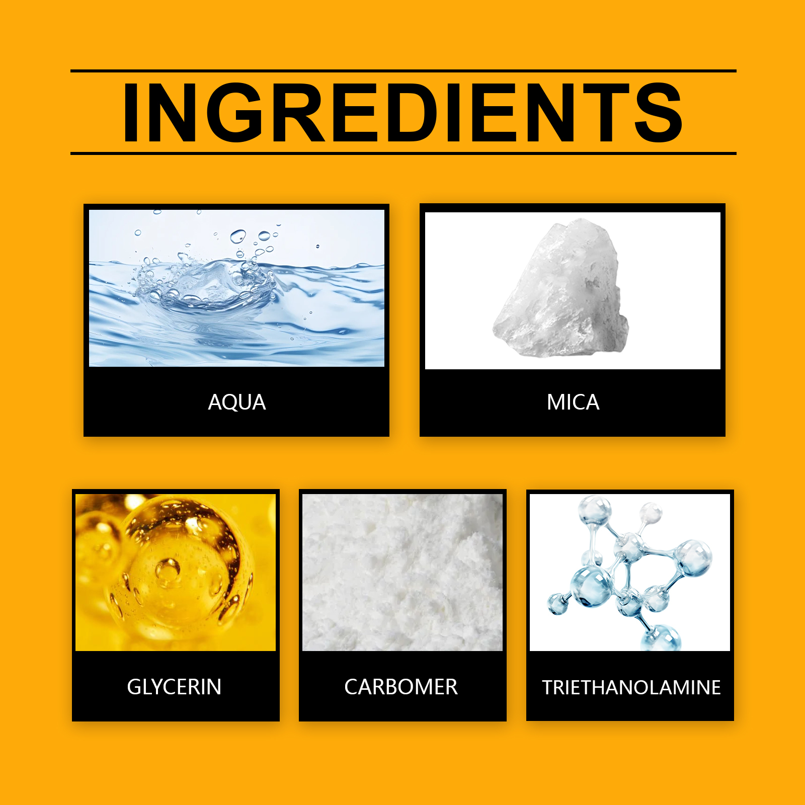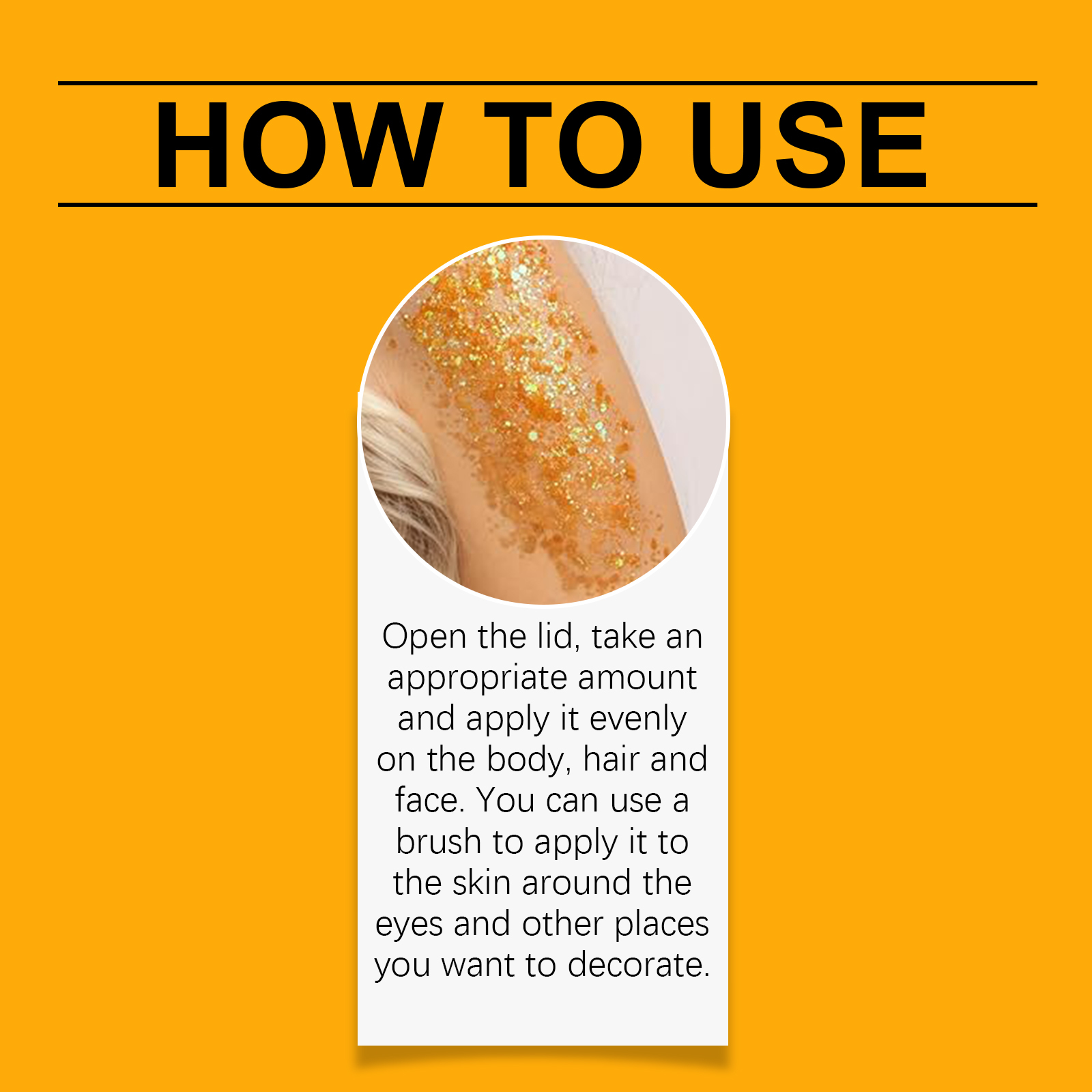 Our glitter sequin gel (orange) contains glycerin, carbomer. It can provide moisturizing effect for the skin and hair, with no greasy feeling after use, refreshing and comfortable. Its usage is simple: open the lid, take an appropriate amount and evenly apply it to the body, hair, and face. You can use a brush to apply it to the skin around the eyes and other areas that need decoration. And it can instantly create a bright luster, full of charm.