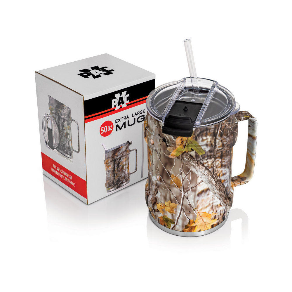 Whether it's game day, camping or a backyard picnic the XPAC by MAXAM Extra Large Mug with handle will keep a whopping 50 ounces of your favorite beverage hot or cold in this vacuum double wall Mug with satin finish stainless steel interior and a CAMO finish stainless steel exterior. Keep contents secure with the clear Tritan flip lid with XPAC logo. The XPAC logo is also embossed on the bottom of the mug.