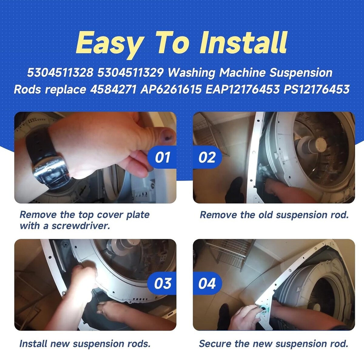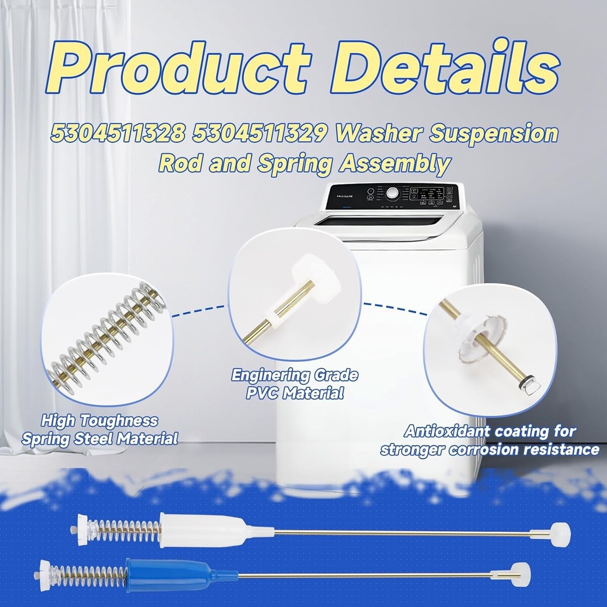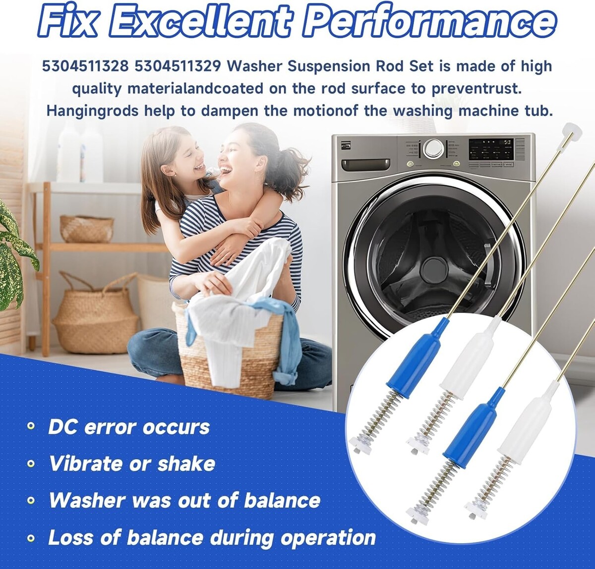 ?Excellent Performance?5304511328 5304511329 Washer Suspension Rod Set can truly solve the following issues: (1)wabbling or shaking, unbalanced issue (2) spinning errors (3)banging noise,(4)showing "DC"error code. Washer suspension rod and spring assembly 5304511328 5304511329 supports the washer tub and keeps it stable during the high-speed sping cycle.