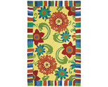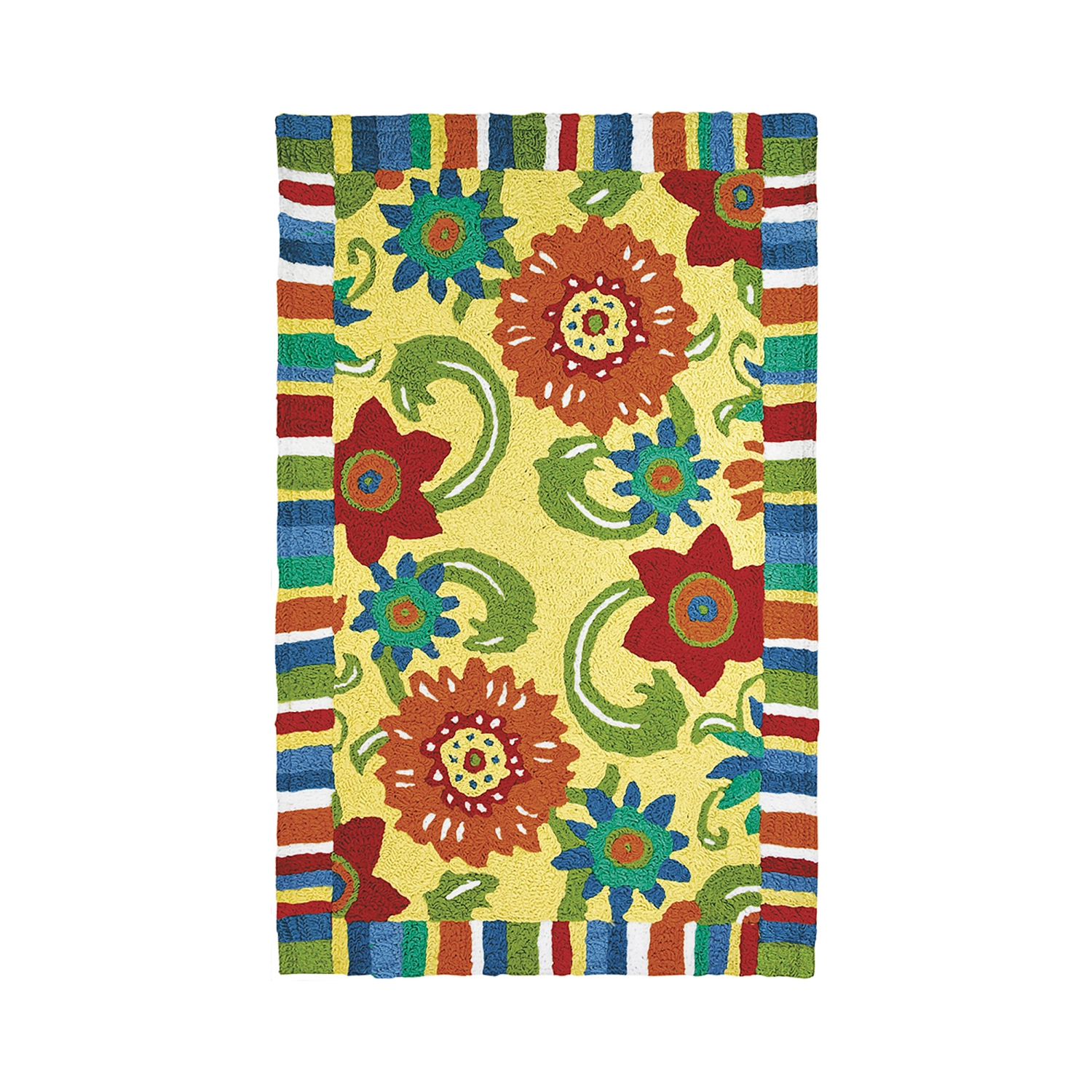 A border of multi colored stripes frames this Home Garden rug design. An assortment of florals in coordinating colors against a pale yellow background makes this rug a fun addition to the space of your choosing. Simple care instructions ensure this Home Garden rug will maintain its vibrancy for many cleanings to come.