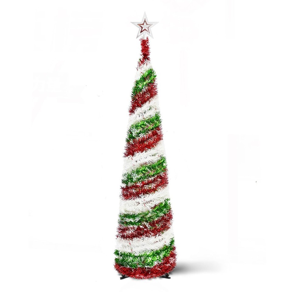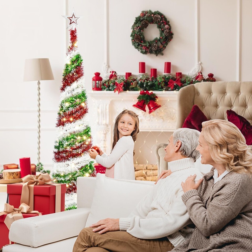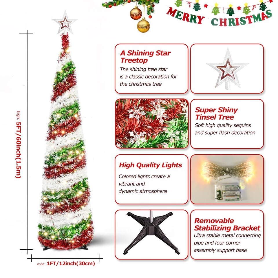 5 FT Pop Up Christmas Tree: This artificial lighted pop up Christmas tree features a tinsel design surrounded by soft, premium sequins, the set includes LED warm lights and a 3D tree-top star decoration to create a sparkling festive atmosphere