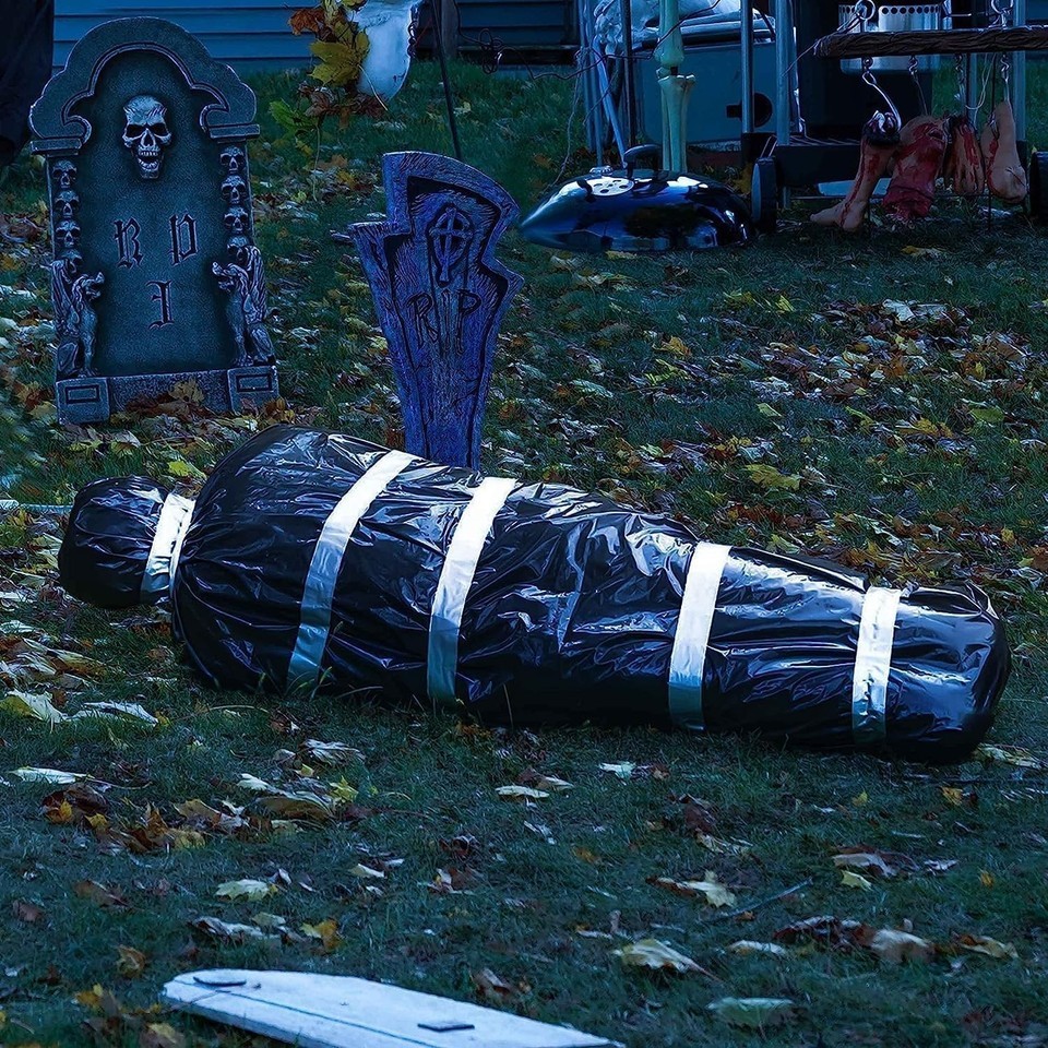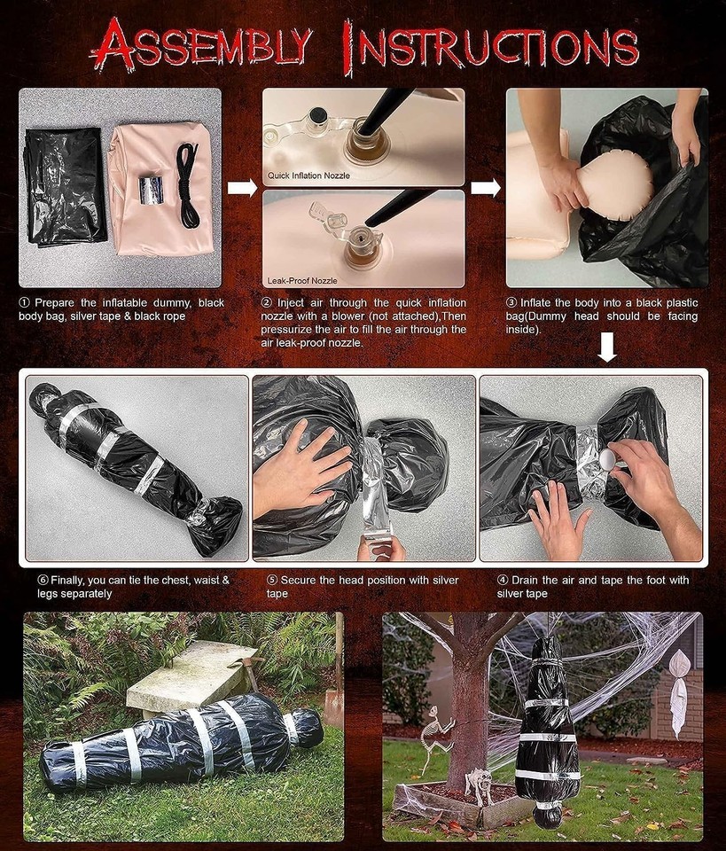 Step-by-step assembly ? First, inflate the mannequin prop, then place it inside the black body bag. Use the rope to secure it, and wrap the silver metallic tape around key parts for a realistic effect. Assembly is required to complete the decoration.