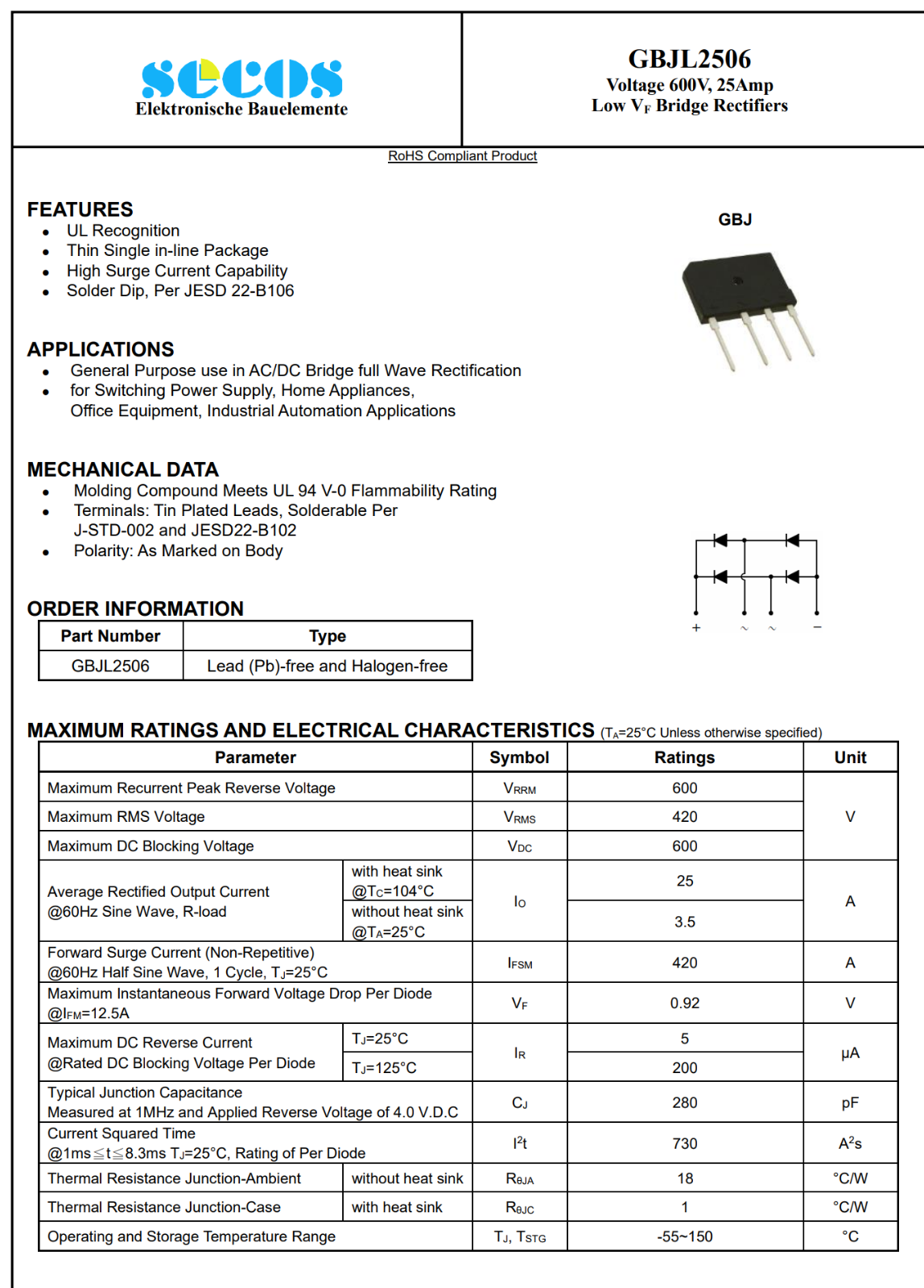 - 5PCS GBJL2506 SeCoS Bridge Rectifier 25A 600V Diode GBJL Low VF Slim High Surge