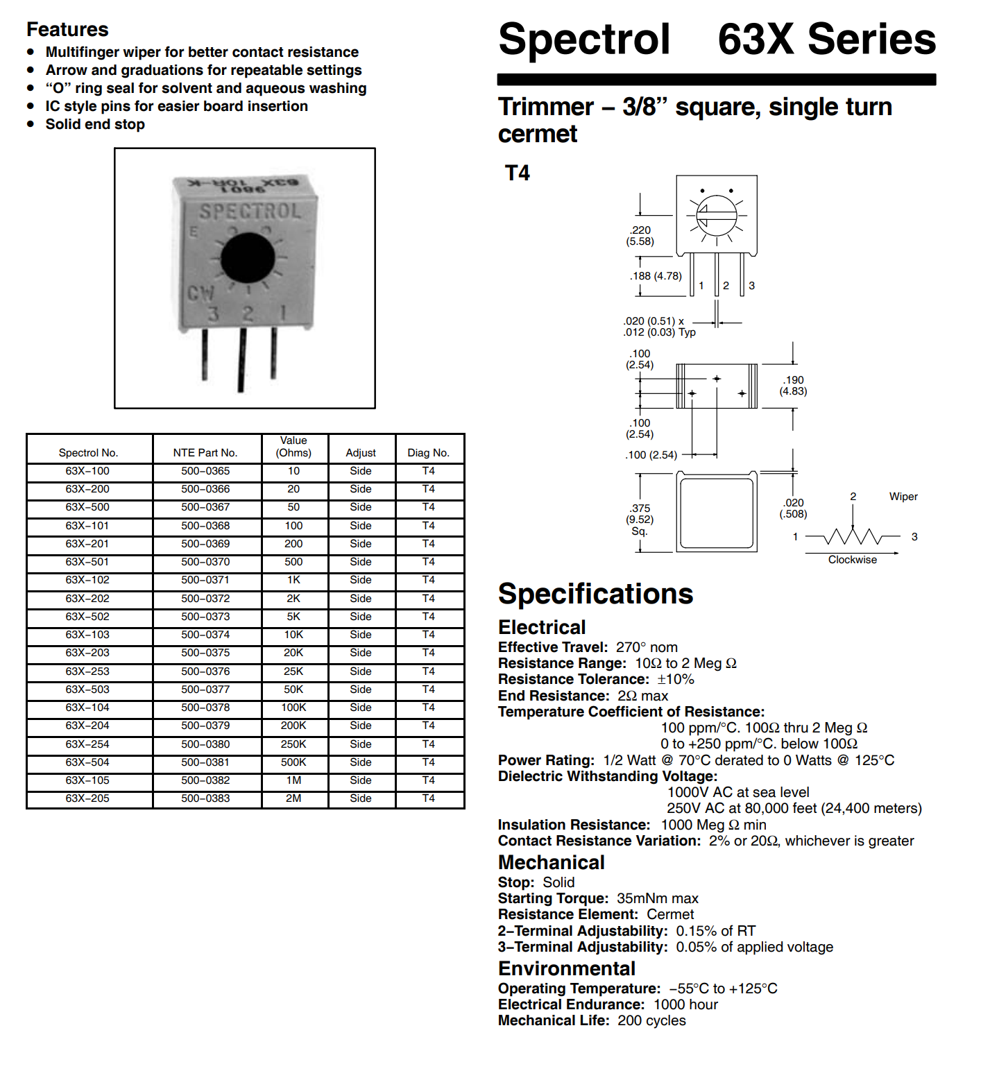 5 Pieces - M63X204K Spectrol Single Turn Cermet Trimmer 200K Ohm 10% Potentiometer 3/8" Square Top Adjust 0.5W Staggered Pins From Side