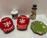 - 5pc Hallmark Red Mitten Serving Dishes, Cookie Tray, and Misc Jar, Snowman