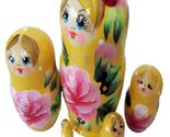 A 5pcs. Floral Russian Nesting Doll with a yellow color scheme. The set is completely hand painted and made out of linden wood. The doll features beautiful faces with floral decor. The tallest doll is 4 inches tall (10 cm) and each doll gets progressively smaller as the set is opened. Made in Russia.