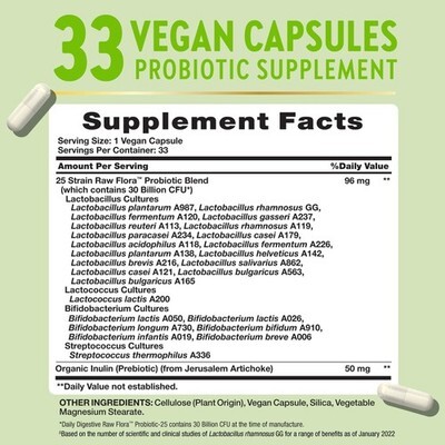 6/2026 Raw Flora Probiotics with Prebiotics | 30 Billion CFU | 33 Daily Digestive Capsules