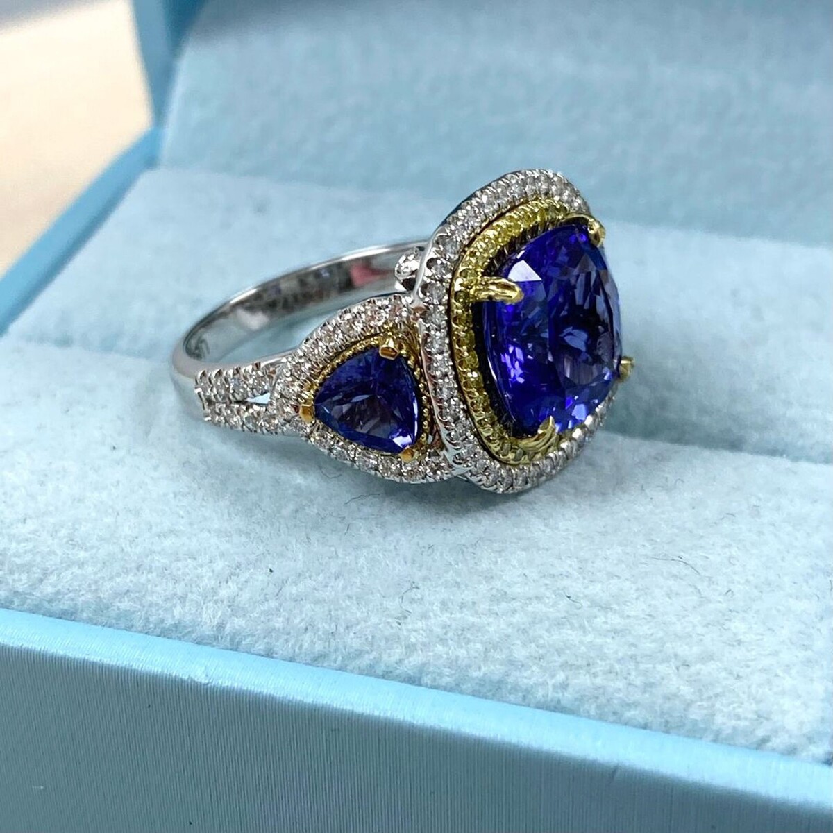 One of the kind engagement ring features a 4.45 carat violet cushion brilliant cut tanzanite surrounded by a double halo of colorless and yellow round brilliant cut diamonds in micro pave setting. Additional diamonds line the shank with 2 trillion cut violet tanzanite completing the shimmering elegance of this ring!!! The ring is crafted of 14-karat two tone gold that shines with a high polish finish. The total carat weight is 6.49 carats. The ring comes with Gemological Institute of America Certificate (GIA). # 7235244111 Our products are all hand made with quality and care, in the heart of the diamond district on 47th Street in New York City. Our dedication and commitment to fine work and quality exceeds all others. Since all of our products are handmade in the USA, every piece shares th