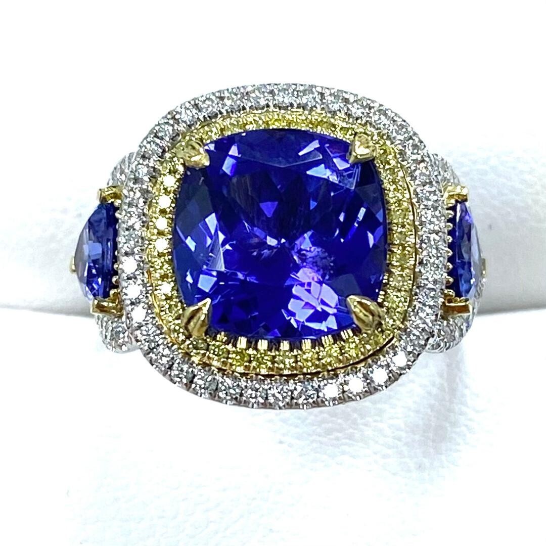 Uno del tipo di anello di fidanzamento presenta un tanzanite a taglio brillante da 4,45 carati violati circondata da un doppio alone di diamanti tagli brillanti rotondi incolori e gialli in ambientazione di micro pavimenti. I diamanti aggiuntivi rivestono il gambo con 2 trilioni di tanzanite viola che completa l'eleganza luccicante di questo anello !!! L'anello e realizzato in oro a due toni da 14 carati che brilla con una finitura polacca alta. Il peso totale dei carati e di 6,49 carati. L'anello viene fornito con il certificato Gemological Institute of America (GIA). # 7235244111 I nostri prodotti sono tutti realizzati a mano con qualita e cura, nel cuore del Diamond District in 47th Street a New York City. La nostra dedizione e impegno per il lavoro e la qualita eccezionali superano tut