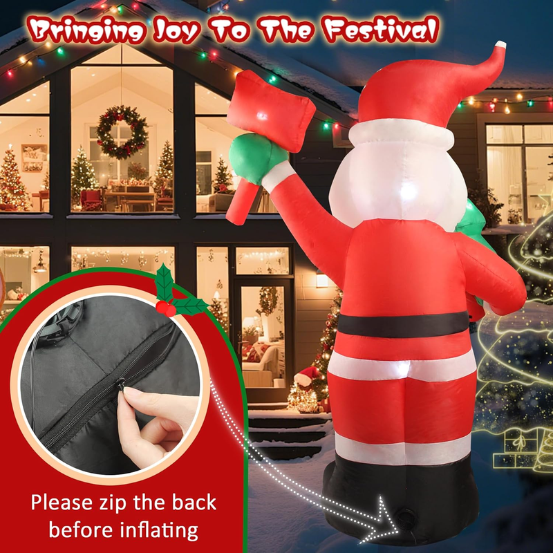 Quick Inflation and Safety Certification ? This outdoor Christmas inflatable Santa Claus decoration comes with a high-performance waterproof fan, uses a CE and UL certified adapter, and includes a 6.5-foot power cord for rapid inflation. It features a bottom zipper for deflation in just one minute, making it convenient for storage and compact storage.