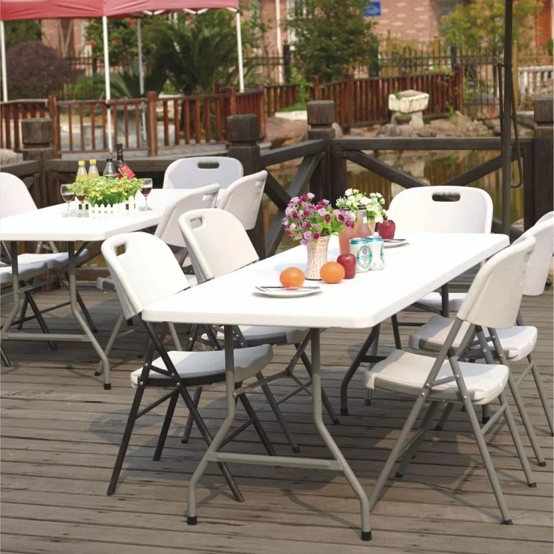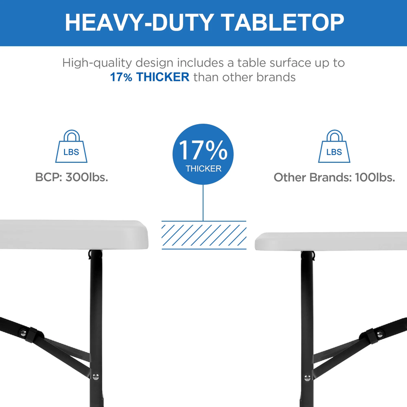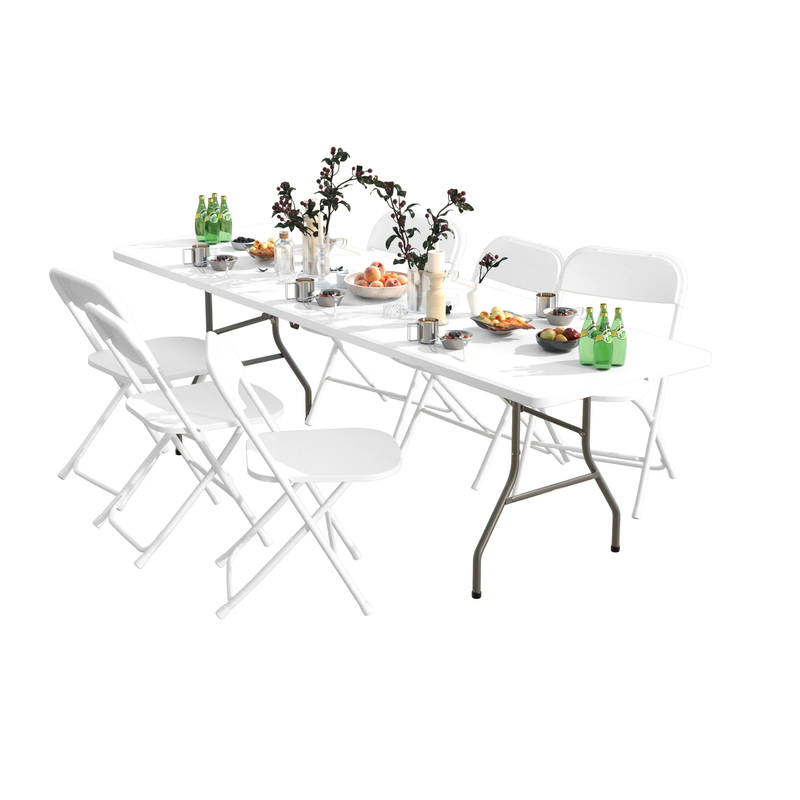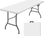 ?Foldable Portable Table Design?This 6ft portable table measures 70.9" (L) 27.6" (W) 29.2" (H) -comfortably seating 6 to 8 adults. Features a half-fold tabletop with built-in handles. It weighs just 22.7 lb, making it effortless to carry and transport. When folded, it stores easily in closets, under beds, or car trunks-perfect for transitioning from indoor meals to outdoor adventures. A true space-saving portable table for all your needs. ?Versatile Indoor Outdoor Use?Whether you need a temporary portable table for parties, picnics, weddings, or camping, this foldable table delivers. Its sleek white surface complements any decor and works great with tablecloths, transforming into a stylish display or dining table for gatherings. Perfect as an outdoor table for cookouts or a foldable dining table for extra indoor seating. Use it as a buffet station, crafting workspace, or temporary work desk- the possibilities are endless! ?Heavy Duty Construction?Built with reinforced steel legs and a high-density plastic tabletop, this table won?t wobble under pressure! It holds up to 100 lbs, making it ideal for camp table, buffet spreads, wedding desserts, camping gear, or workshop projects. The powder-coated steel frame prevents rust, while the thick plastic surface resists cracks and dents, making it suitable for both utility and dining use. ?Easy to Clean Set Up in Seconds?This white folding table features a smooth, stain-resistant surface that wipes clean instantly-just use a damp cloth! No tools are needed for assembly: simply unfold, lock the sturdy steel legs into place, and it?s ready for use. The weather-resistant plastic won?t warp or fade, making it perfect for outdoor picnics table, BBQs, or indoor parties. A hassle-free, time-saving design that?s as durable as it is convenient! ?Purchase Folding Table with Confidence?Designed for reliability and everyday use, our folding table offers sturdy, wobble-free performance for events big and small. Should you have any questions or need assistance, our customer service team is ready to provide support. We are committed to ensuring you have a positive experience with your purchase.