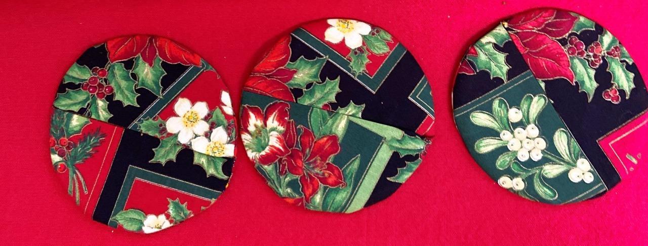 6 Hand Sewn Christmas Round Wine Coasters 2 Patterns Snowmen & Holly w Berries