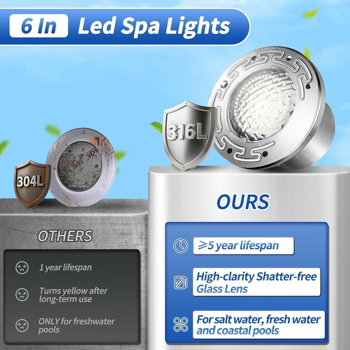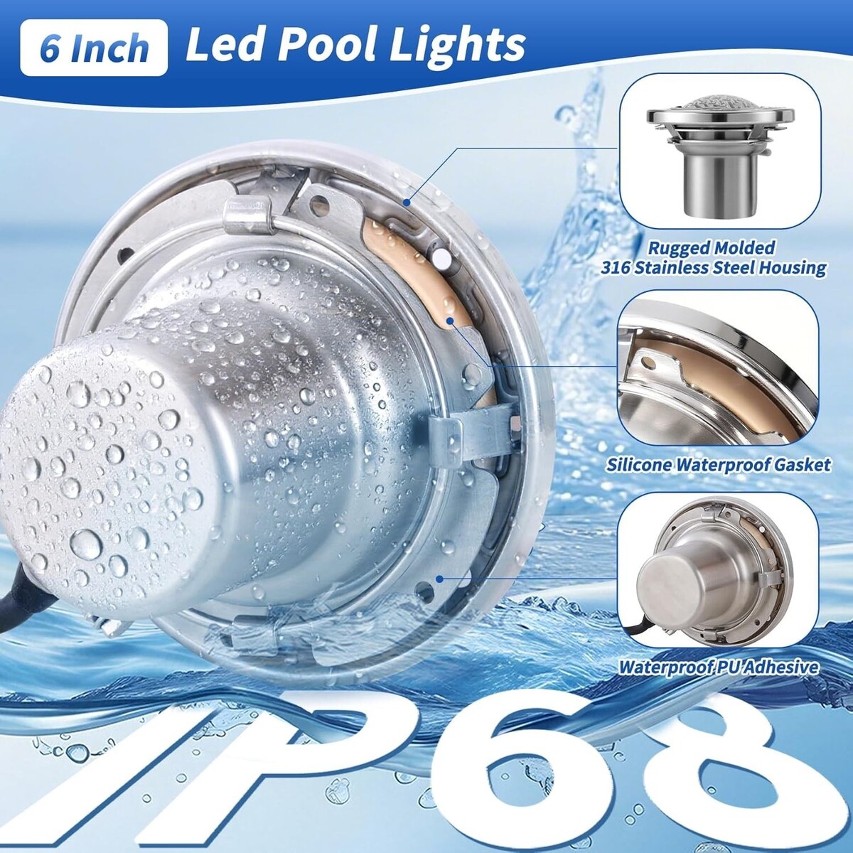 ?Durable Long-Lasting?This 6 inch LED pool lights features a high-quality 316 stainless steel housing, boasting exceptional corrosion resistance to withstand harsh pool environments. Its integrated design ensures a tight seal, meeting the IP68 waterproof standard. Rigorously tested, it delivers reliable performance for up to 5 years