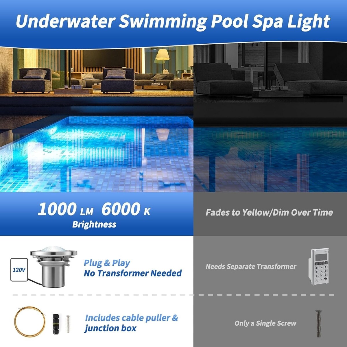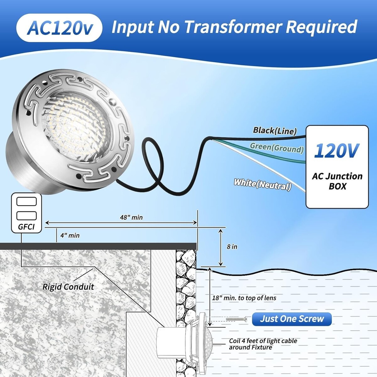 ?120V Plug-and-Play Installation?This 6 inch white spa light is a direct replacement for most standard wet niches?including popular Pentair and Hayward models. Designed for 120V AC, it plugs directly into your home power supply. No extra transformer needed. Save money, skip the hassle, and enjoy easy installation.