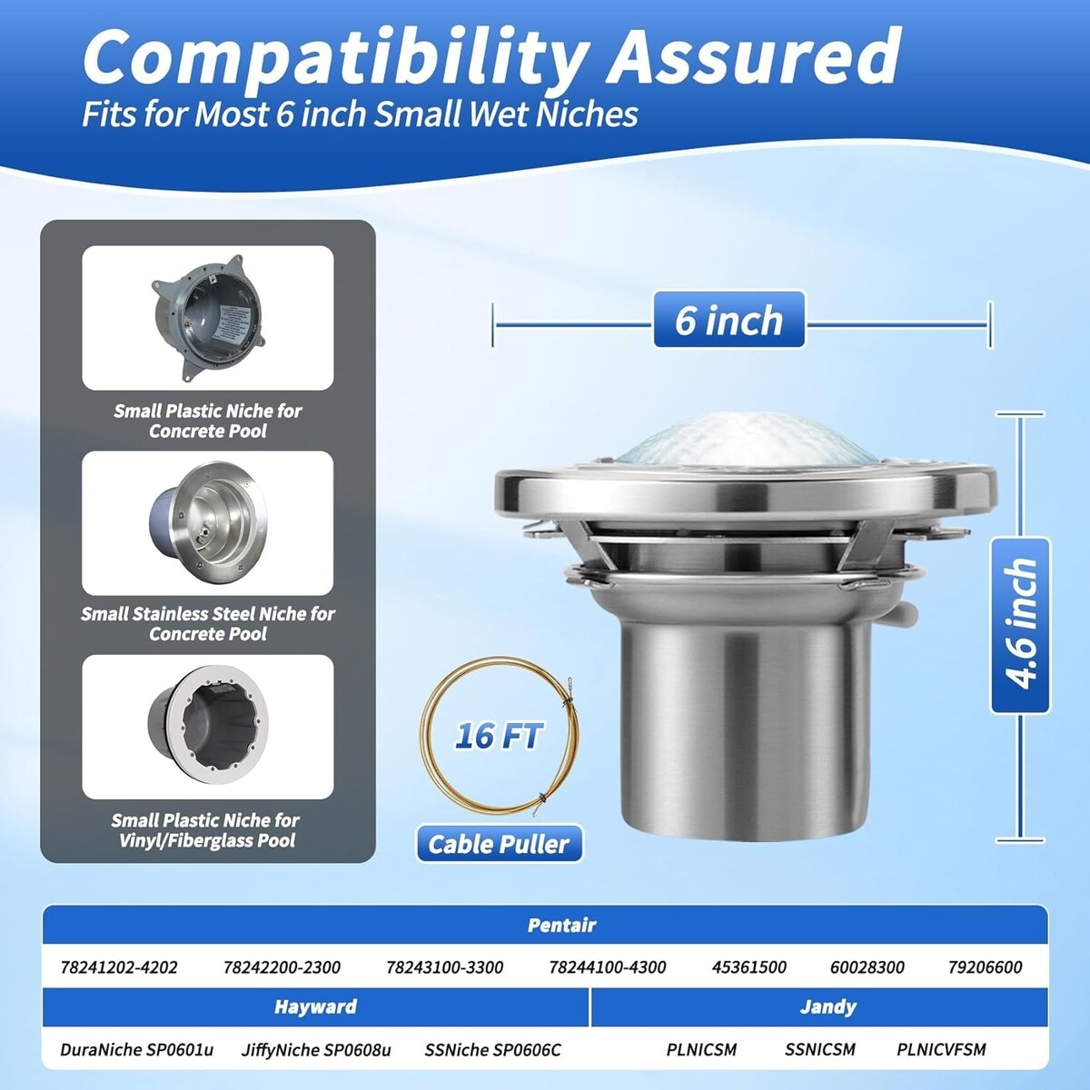 ?Complete Accessories?This 6? white pool light includes a 16.5ft wire threader and a pre-wired junction box for frustration-free installation. The threader smoothly guides cables through conduits, while the junction box delivers safe, code-compliant connections. Everything is included?no extra parts or trips needed