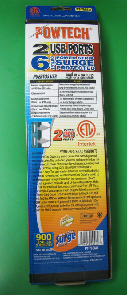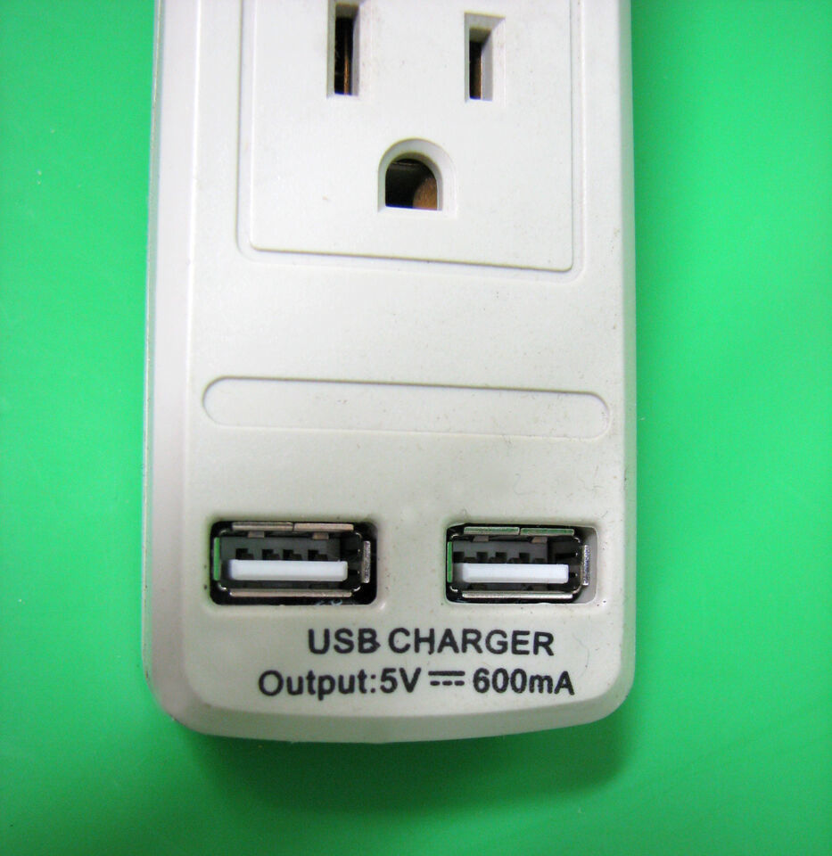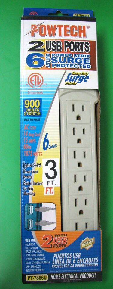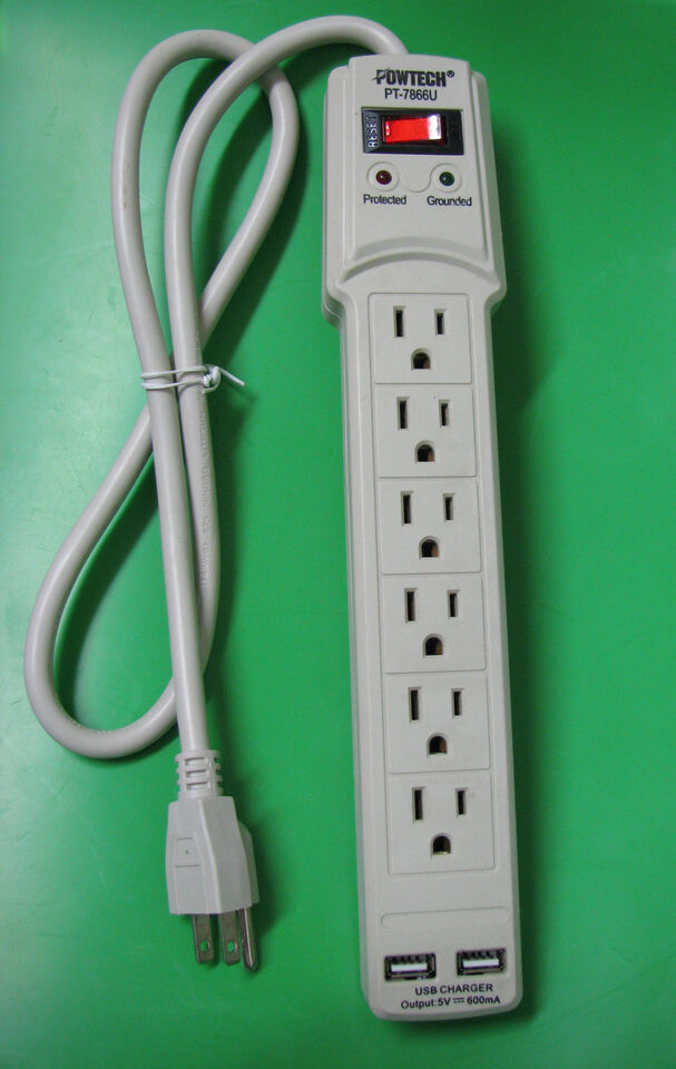 - 6 Outlet Power Strip Surge Protected 2 USB Charger Port, 900 Joules, 3 Feet Cord