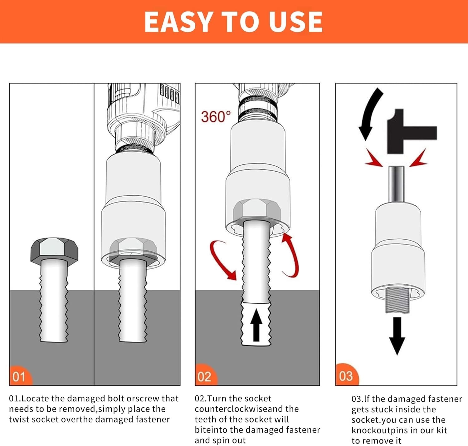 Simply position the socket onto the damaged fastener and use an impact wrench, power drill, hand ratchet, or breaker bar to turn it. Once loosened, tap the nut out of the socket using the included round bar, and the task is complete