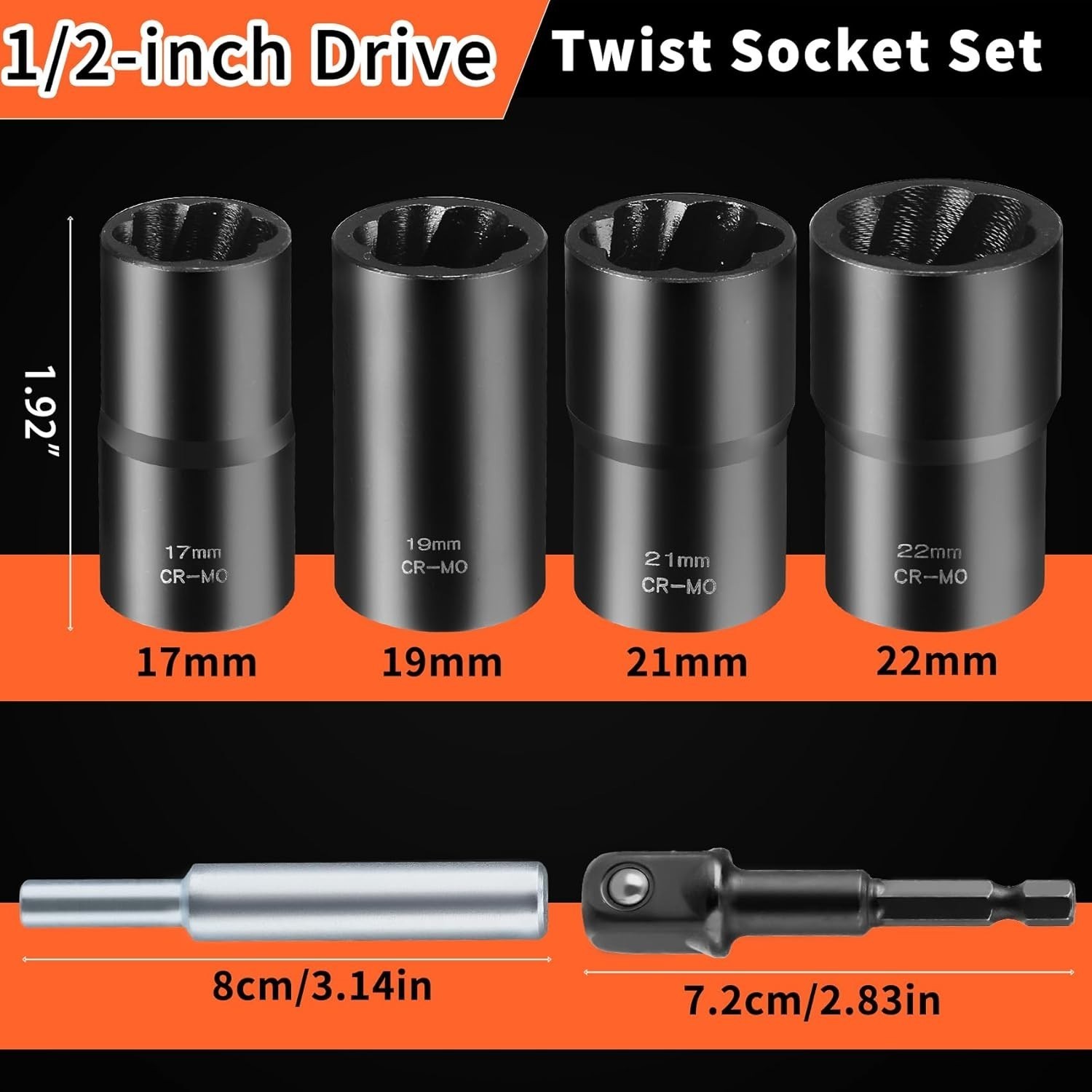 - 6 PCS Twist Socket Set, Stripped Lug Nut Remover Wheel Lock Removal Kit Extracto