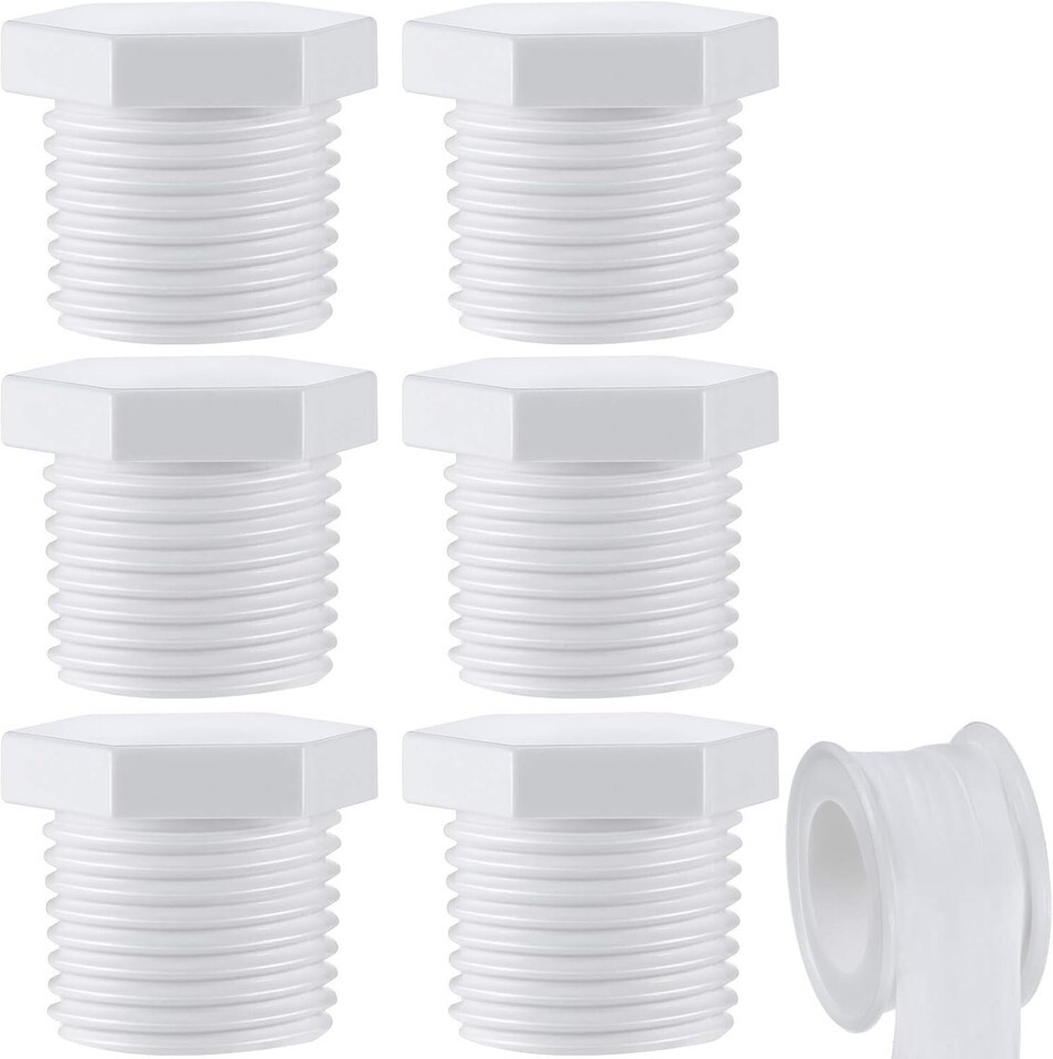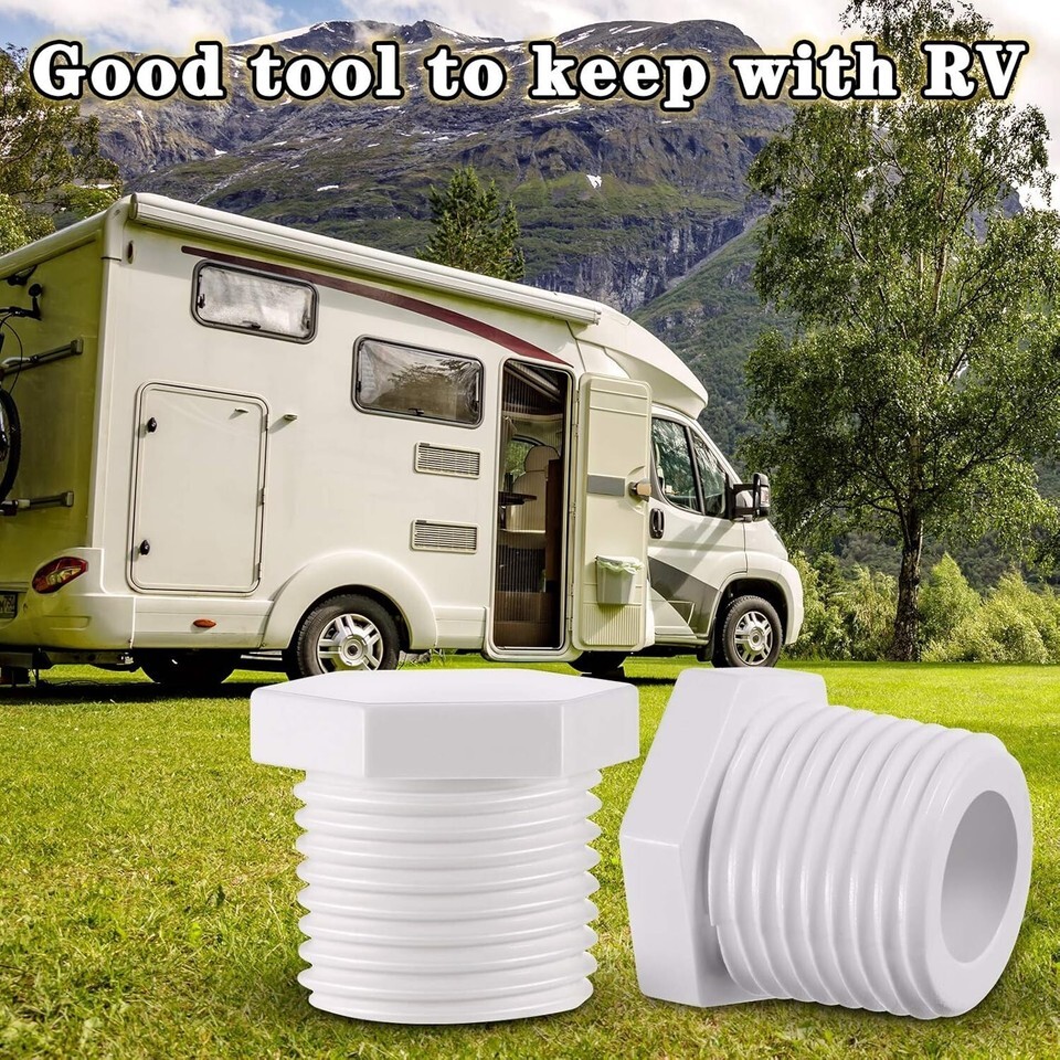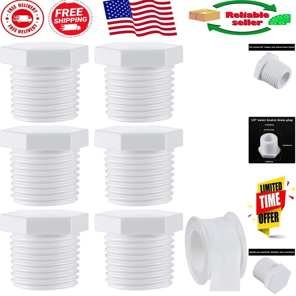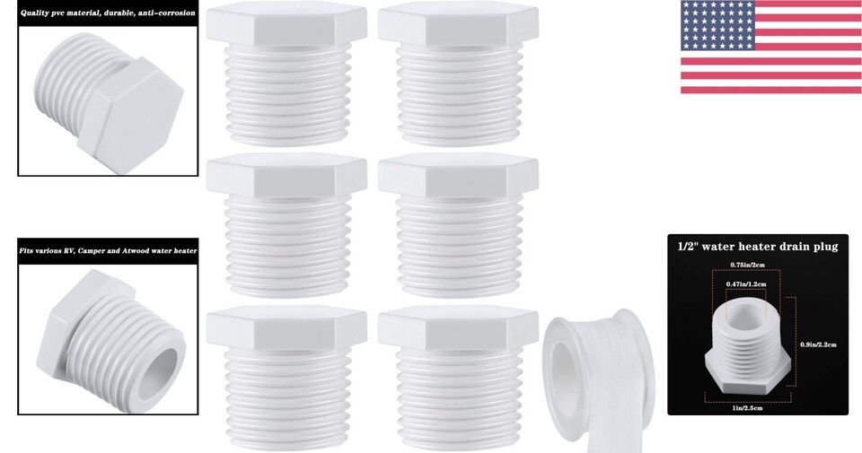 - 6-Pack RV Drain Plug Set with Leak-Proof Tape, Fits 1/2 Inch NPT Water Heaters