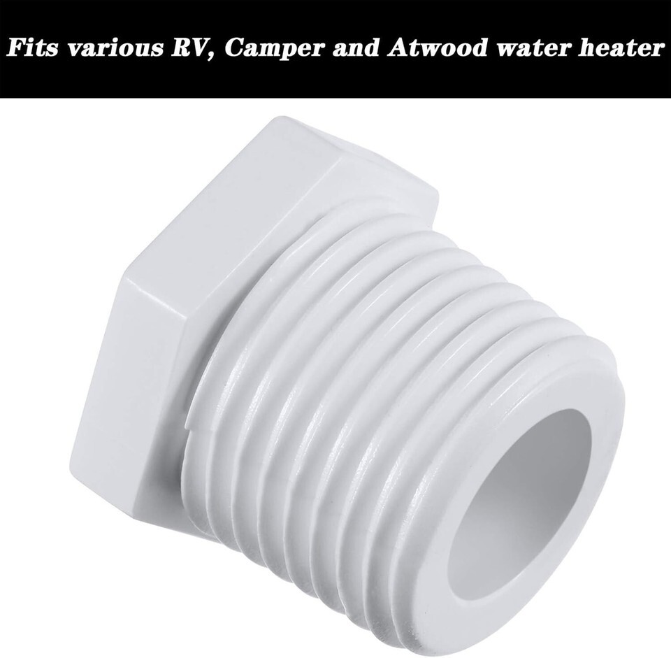 White plastic drain plugs compatible with RV, Camper, and Atwood water heaters.
