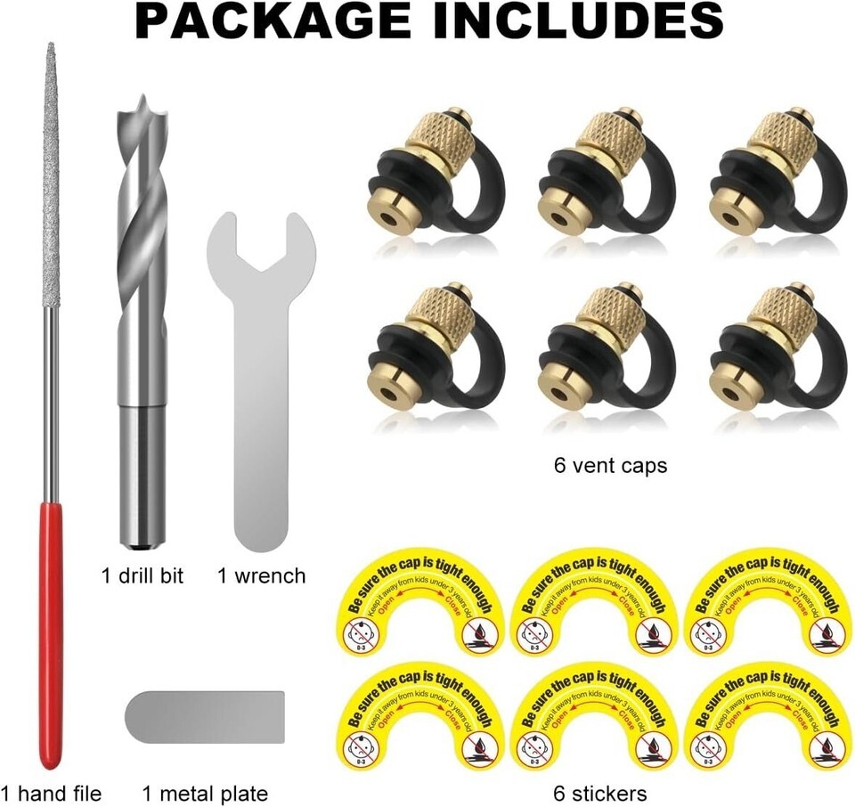 Includes 6 vent caps, 1 drill bit, 1 wrench, 1 metal plate, 1 file, and 6 stickers for a complete solution.
