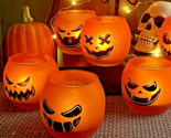 6 Pc Halloween Pumpkin Grimace Votive Holders Orange Glass Tealight Décor Spooky