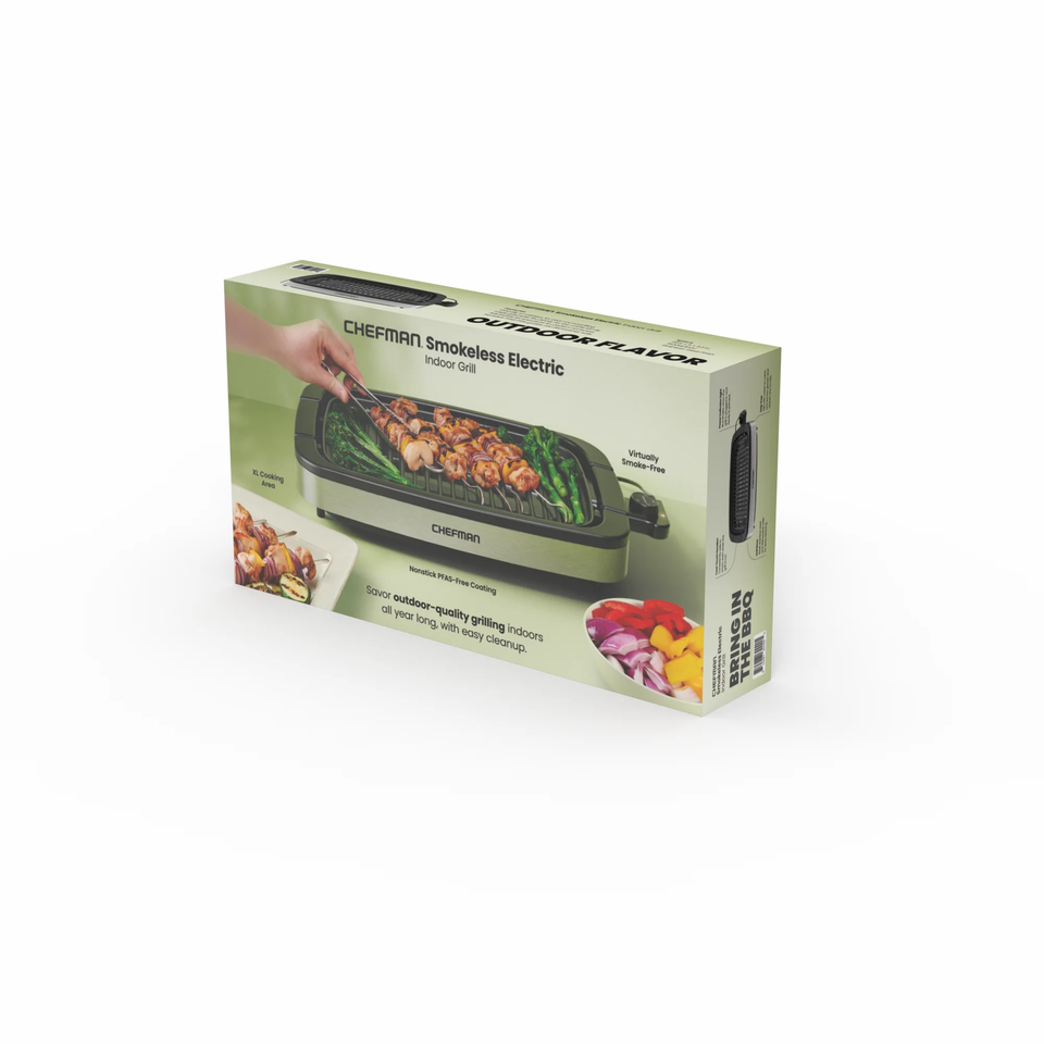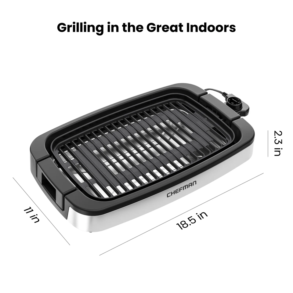 The Chefman Smokeless Indoor Grill turns your backyard grilling into high-end kitchen cooking. The water-filled drip tray allows for virtually smoke-free grilling inside, and the temperature-controlled heat gets dinner done just the way you like it. Make meals for a crowd with the extra-large cooking area and keep cleanup simple with the nonstick grate, dishwasher-safe base, and drip tray. Purchase includes a 1-year assurance from Chefman. 1500 Watts/120 Volts ? RJ23-SPG-SS - Stainless Steel New