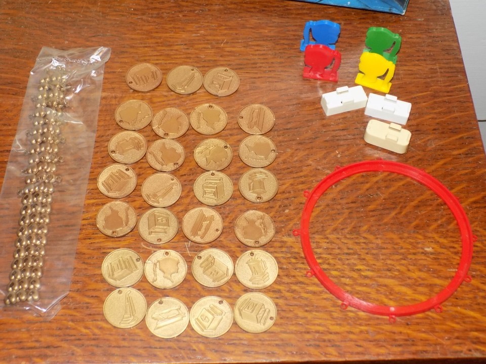 card, 4 playing pieces and cardboard wheels and instruction sheet. Items have