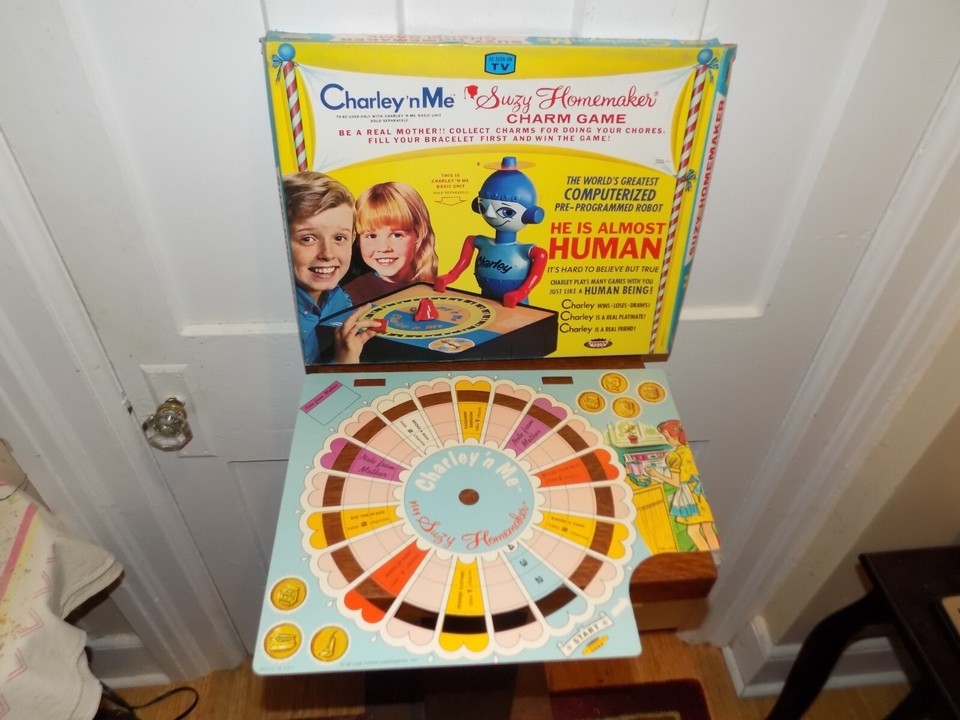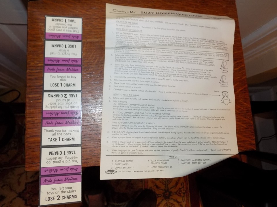 instruction sheet; Suzy Homemaker Charm Game w/ card, and playing pieces and