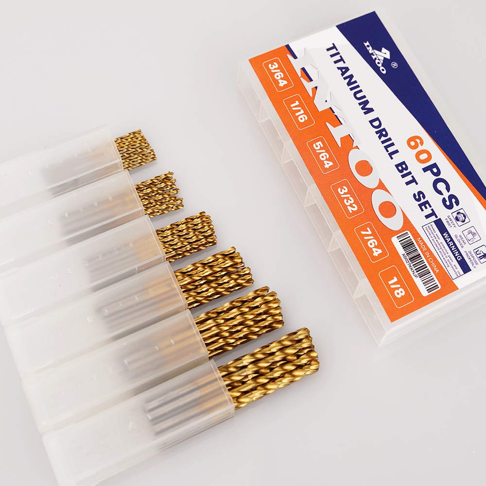The INTOO 60-Piece Mini Drill Bit Set is an essential addition to any DIY enthusiast or professional's toolkit. This comprehensive set includes a variety of drill bits designed for precision drilling in metal, wood, and plastic. With sizes ranging from 3/64 inch to 1/8 inch, you will have the right bit for any project at your fingertips. The high-speed steel construction ensures durability and longevity, while the titanium finish provides enhanced performance and resistance to wear.