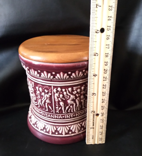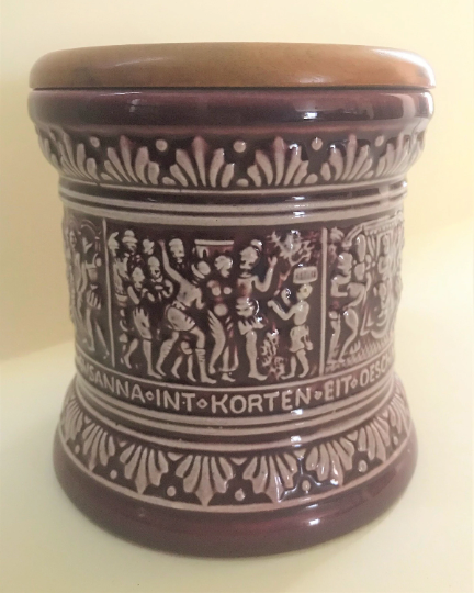 This ceramic humidor comes from the late 1960's but features a medieval German scene of "Suzanna And The Elders" as written from the apocryphal book of Daniel in the old testament.