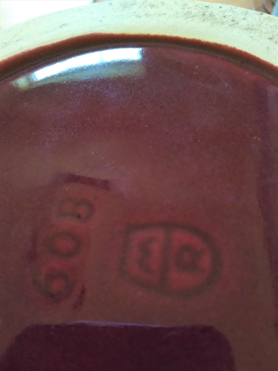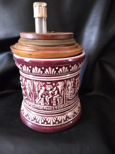 In this listing we're. featuring a 1960's vintage German Marzi and Remy ceramic tobacco humidor with a hardwood lid. On it's bottom, although very difficult to to see, there is stamped in the Maroon glazing a M R insignia which are the Marzi and Remy company's insignia initials.