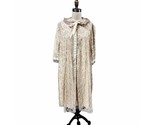This lovely vintage 1960s-era robe from Odette Barsa is made of 100% nylon with intricate beige Chantilly lace detail over a creamier color inner nylon layer; The inside of the nylon liner is brushed nylon. Snap front on the robe. The robe has an A-line shape, and 1 Side Seam pocket.
