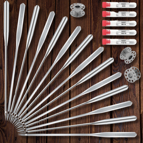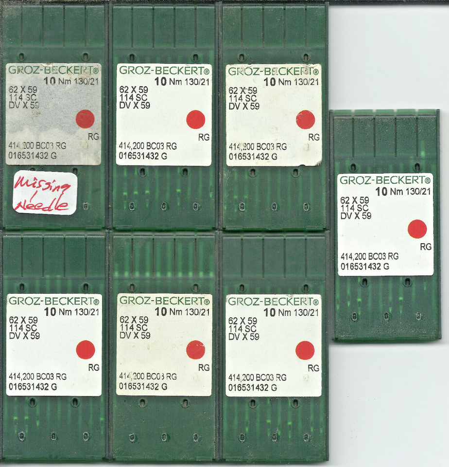 FOR SALE IS THIS LOT OF 69 count 62X59 114SC DVX59 RG type INDUSTRIAL SEWING NEEDLES MADE BY GROZ-BECKERT. SEVEN (7) PACKS OF 10 WITH ONE (1) NEEDLE MISSING = 69 TOTAL NEEDLES. THIS IS AN UNIVERSAL POINT NEEDLE AS INDICATED BY THE "RG" DESIGNATION ON MANUFACTURERS PACKAGING MEANING NORMAL ROUND POINT WITH A SMALL BALL, SUITABLE FOR GENERAL PURPOSE APPLICATIONS. THIS NEEDLE SYSTEM 62X59 INDICATES EQUIVALENT SYSTEM NUMBER DBX59, 114SC. ALL THE (69) NEEDLES IN THIS LOT ARE OF THE SAME LENGTH AND SHANK SIZE, ALL ARE BRAND NEW IN MANUFACTURERS PACKAGING. YOU SHOULD MATCH YOUR NEEDLE SYSTEM TO YOUR MACHINE FIRST, THEN THE SIZE OF THE NEEDLE TO THE PRODUCT YOU ARE SEWING. YOU WILL RECEIVE THIS LOT OF 69 SEWING NEEDLES BY GROZ BECKERT, AS PICTURED, SHIPPED BY USPS....