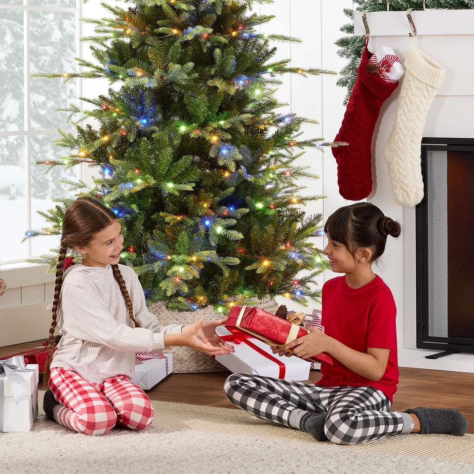 CLASSIC NOBLE FIR: Specially built branches combine premium-quality PE PVC to recreate the stiff, horizontal pattern of the iconic tree-combining convenient construction with realistic appeal HIGH-QUALITY: Realistic and flame-retardant branch tips provide a stiff, strong foundation for the heaviest ornaments, while a metal base keeps your tree upright for the holiday ahead! EASY ASSEMBLY CORDLESS CONNECTION: This 3-step assembly features a cordless light system-just stack the sections of the tree, fluff, and plug in the base; Fluffing times (4.5ft/6ft/7.5ft/9ft/12ft): 15-30 min/ 30-45 min / 45-60 min/ 1-1.5hrs/1.5-2hrs FULL APPEARANCE: Thousands of tips create an even and full appearance with plenty of space for decoration; Number of tips (4.5ft/6ft/7.5ft/9ft/12ft): 750/1,350/2,136/3,088/5,748 9 LIGHT FUNCTIONS: Cycle between 9 light sequences as hundreds of 2-in-1 warm white and multicolored LED lights come to life and add a dynamic touch to the holidays; Light Counts (4.5ft/6ft/7.5ft/9ft/12ft): 150/300/400/600/1000