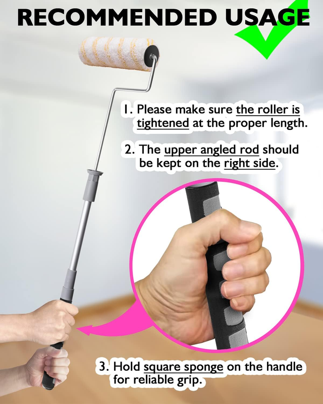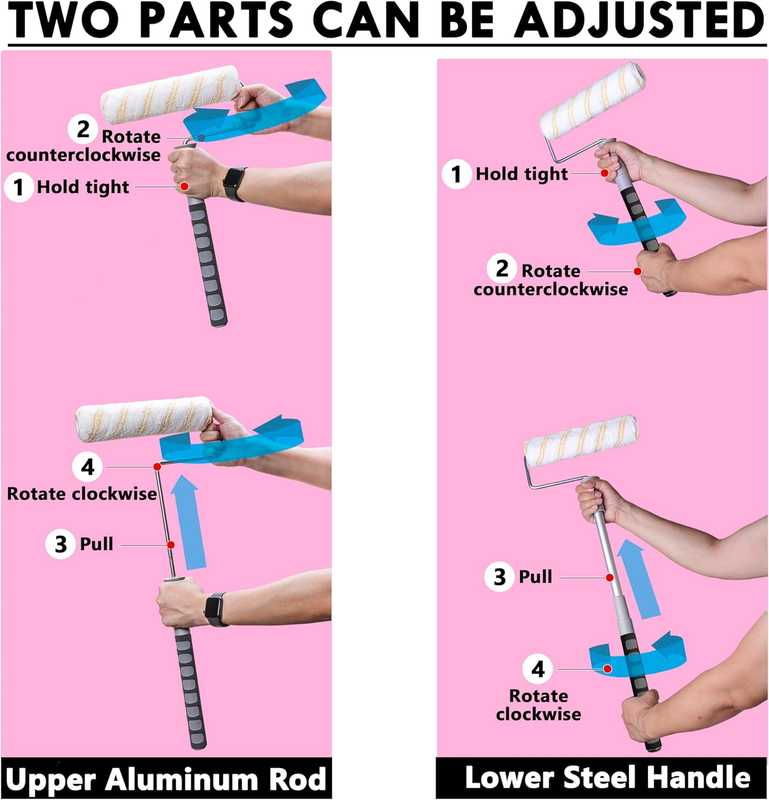 ?Adjustable Extension?The 9 inch paint roller frame can be stretched from 18 inch to 36 inch. Twice the length in five seconds, easily reaches higher without a ladder. Just simply rotate and stretch or fold, you can adjust the rod to any length as you wish.
