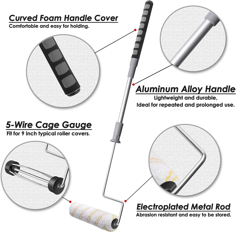 Sturdy 5-wire Cage Style Frame is suitable for all standard 9 inch roller covers. Alluminum Rod is anti-rust and easy to be stored. Aluminum Alloy Handle is lightweight and long-lasting, ideal for repeate and prolonged use. Handle with Curved Foam is comfortable and easy for holding. The ONLY right part for holding when painting.