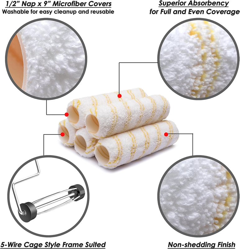6Pcs House Paint Roller Kit, 9 Inch Extendable Roller Frame with 5 Microfiber R