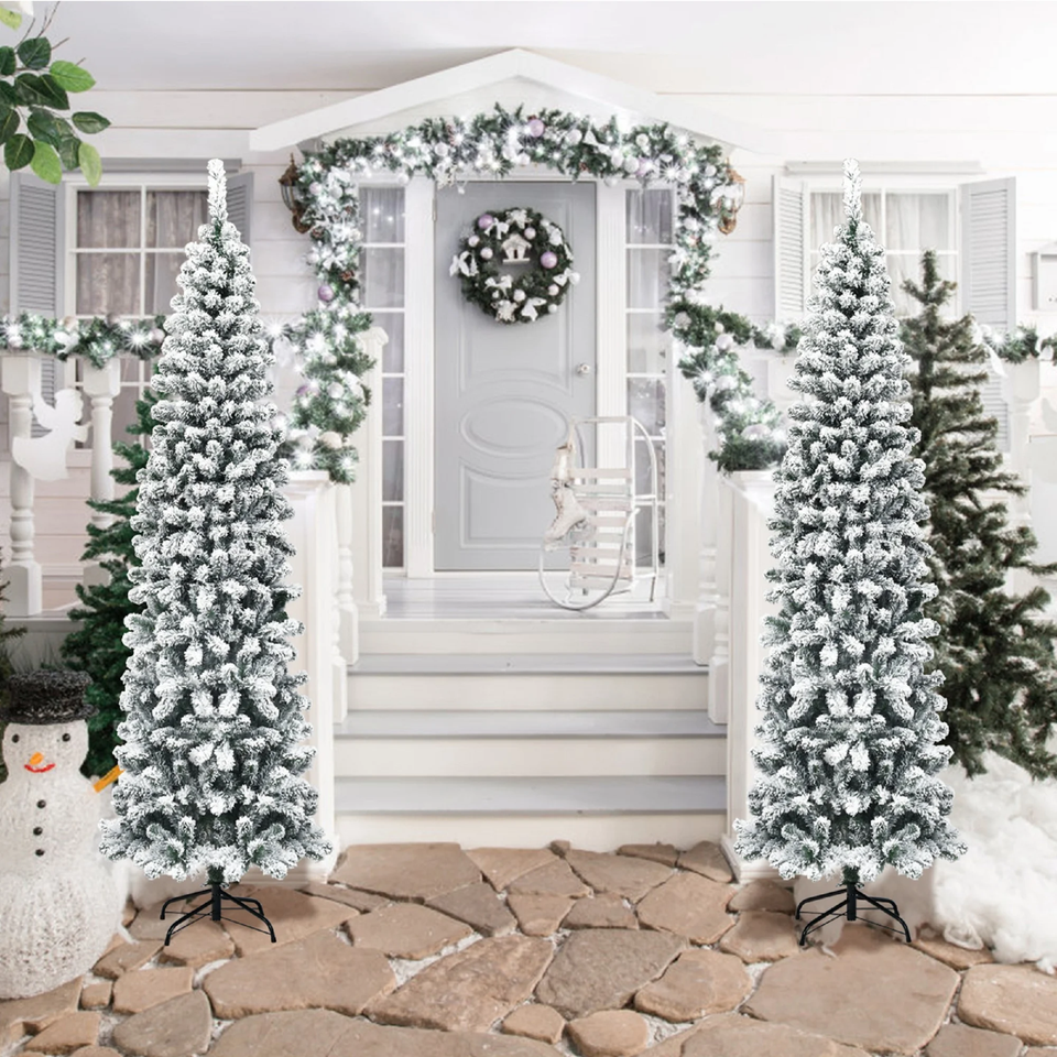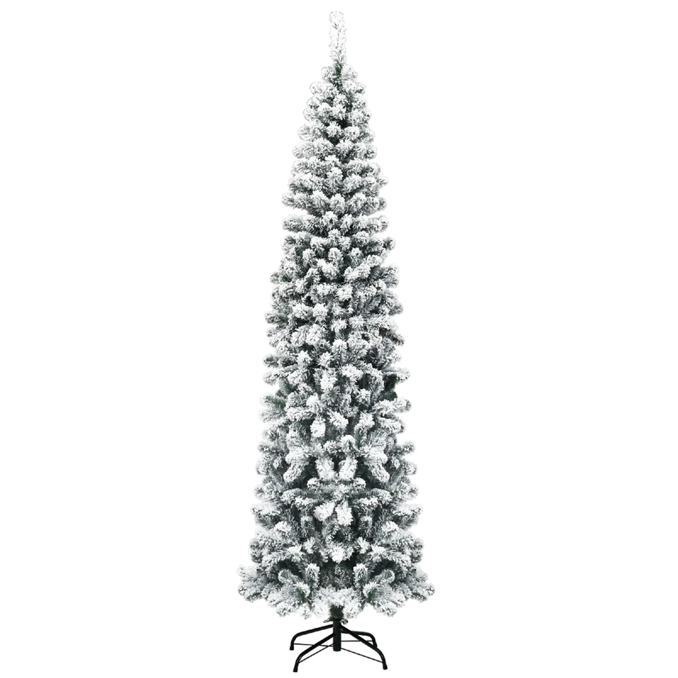 Snow Flocked Pencil Christmas Tree: Crafted with 641 branch tips, this 7.5 ft snow flocked Christmas tree is leafy and elegant. It will add a unique wintry feel to any setting. With its slim pencil design, this artificial Xmas tree is space-saving and perfect for display in corners or rooms with limited space. Premium PVC Needles: The leaves of this slim Christmas tree are made of high-quality PVC material. Combining premium material and exquisite craftsmanship, these snow flocked leaves are not only lifelike but also of strong adhesion. Thus, they are not easy to fall off and fade, ensuring long term use. Sturdy Metal Stand: This pencil Xmas tree features an X-shaped iron stand that provides strong support. Compared with other cheap plastic bases, the metal stand is more stable and breakage-resistant, keeping it standing upright for years to come. Besides, the metal stand is foldable to facilitate storage. Easy to Fluff and Assemble: All hinged construction makes the artificial tree easy to fluff and set up, saving you a lot of time and effort. In addition, this Christmas tree can be divided into 3 sections and placed in a storage bag, allowing you to store it for future reuse conveniently. Eye-Catching Addition for Any Place: Snow flocked leaves create a unique wintry feel, making this 7.5 ft Christmas tree an eye-catching addition for any place. You can either put it at home to add Christmas atmosphere and celebrate Christmas with family members pleasantly, or put it in shops to attract the attention of customers.