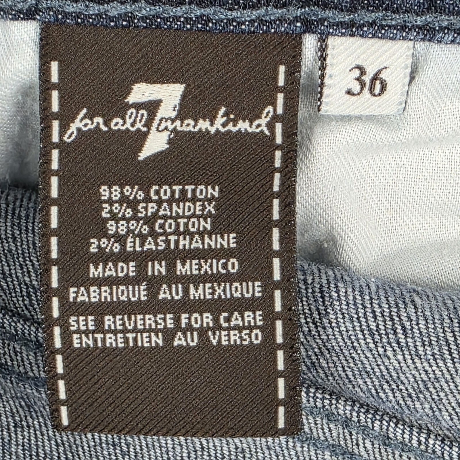 The product is a pair of 7 For All Mankind Slimmy Jeans for men in a size 36 and a dark blue wash. These slim fit denim jeans feature a stretch fabric for added comfort and flexibility. With a mid rise, straight leg style and 5-pocket design, they are perfect for all seasons and occasions. The jeans also have subtle accents such as button and zipper closure, and a logo on the back pocket. Made from a polyester blend with spandex and cotton, these modern and American-inspired jeans are machine washable.