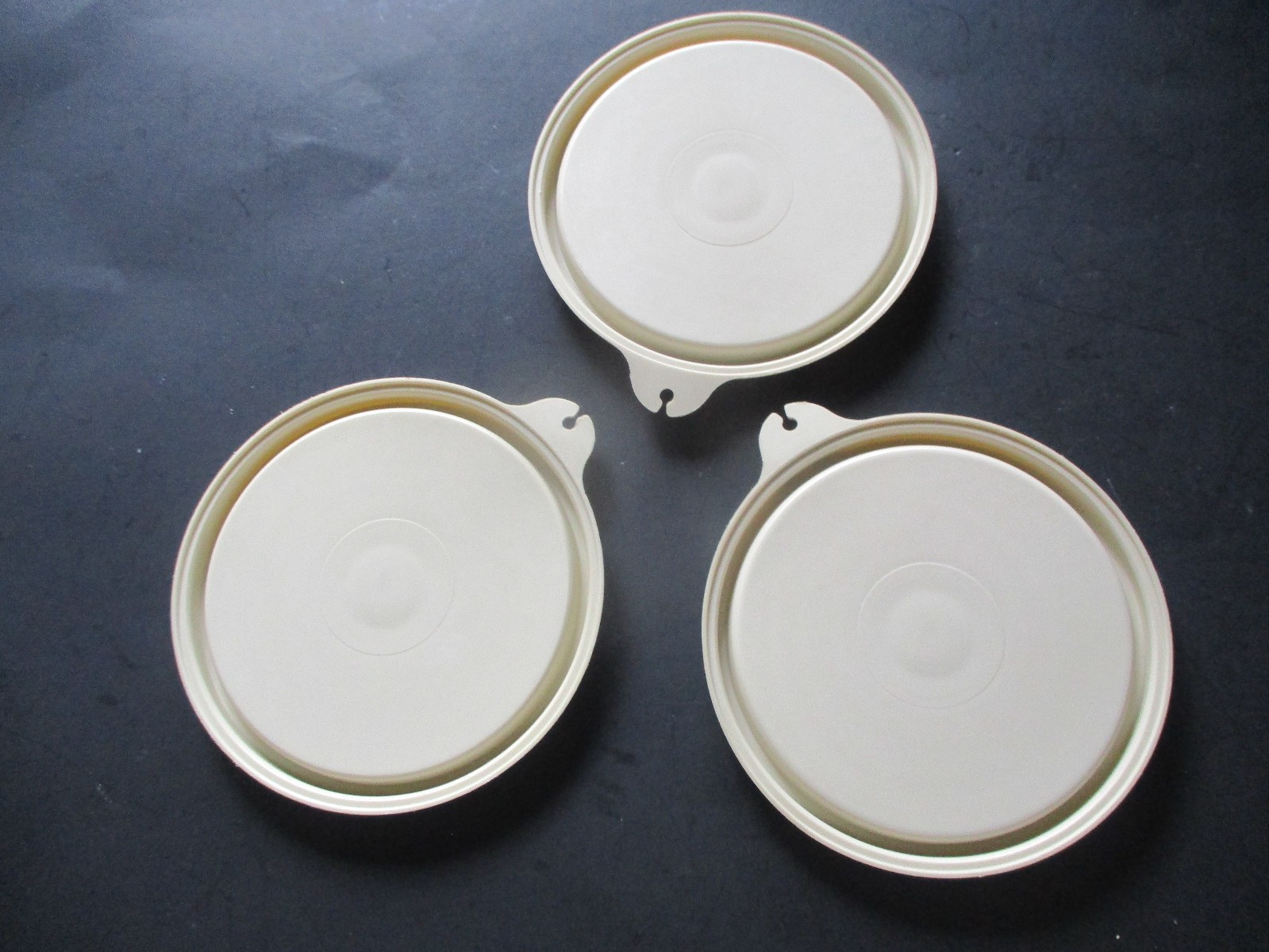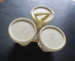 This 7-piece Tupperware condiment caddy set in Harvest Gold with off-white cups is a vintage collectible from the 1970s. Made in the USA, this round medium-sized set includes 3 compartments with a solid gold color and features a lid for each container. The set is designed for adult use and showcases a retro style, perfect for those who appreciate vintage kitchen storage and organization items. This Tupperware lid set is a nostalgic addition to any kitchen, offering both functionality and a touch of mid-century charm.