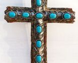 - 7"Tall Rustic Western Faux Distressed Wood Wall Cross With Turquoise Pebble Gems