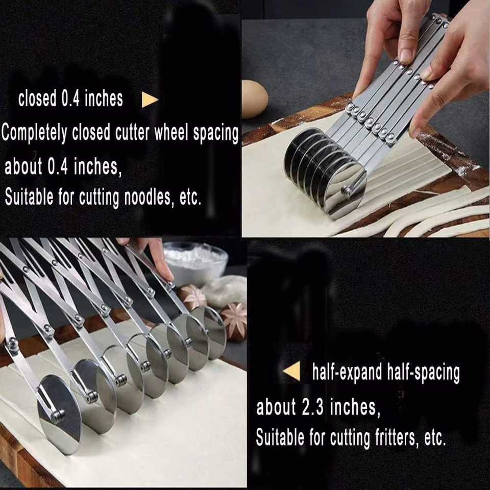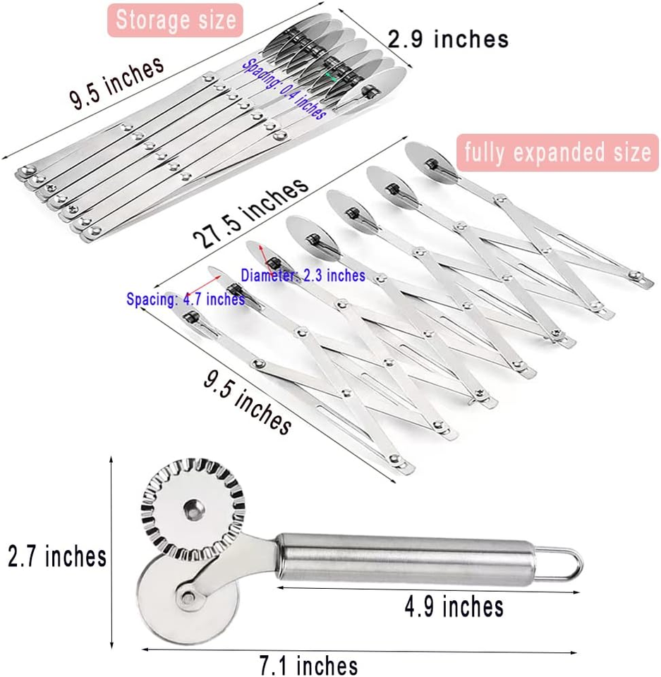 ?7-Wheel Pastry Cutter Dimensions?: The full stretched length is approximately 29.2 inches, with a width of 4.1 inches; when retracted, it measures about 9.5 2.8 2.1 inches, making it compact and easy to store.